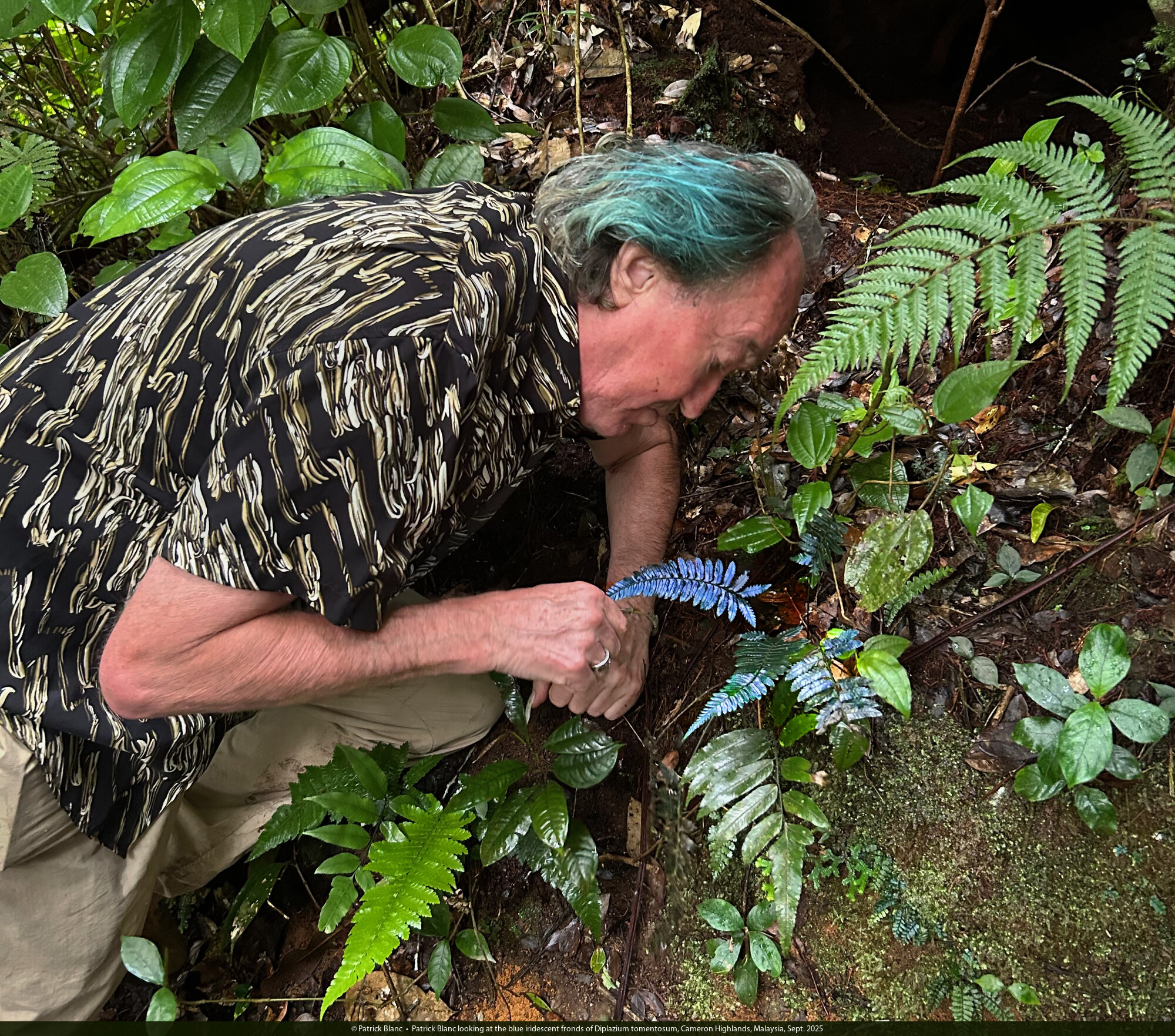 • Patrick Blanc looking at the blue iridescent fronds of Diplazium tomentosum, Cameron Highlands, Malaysia, Sept. 2025