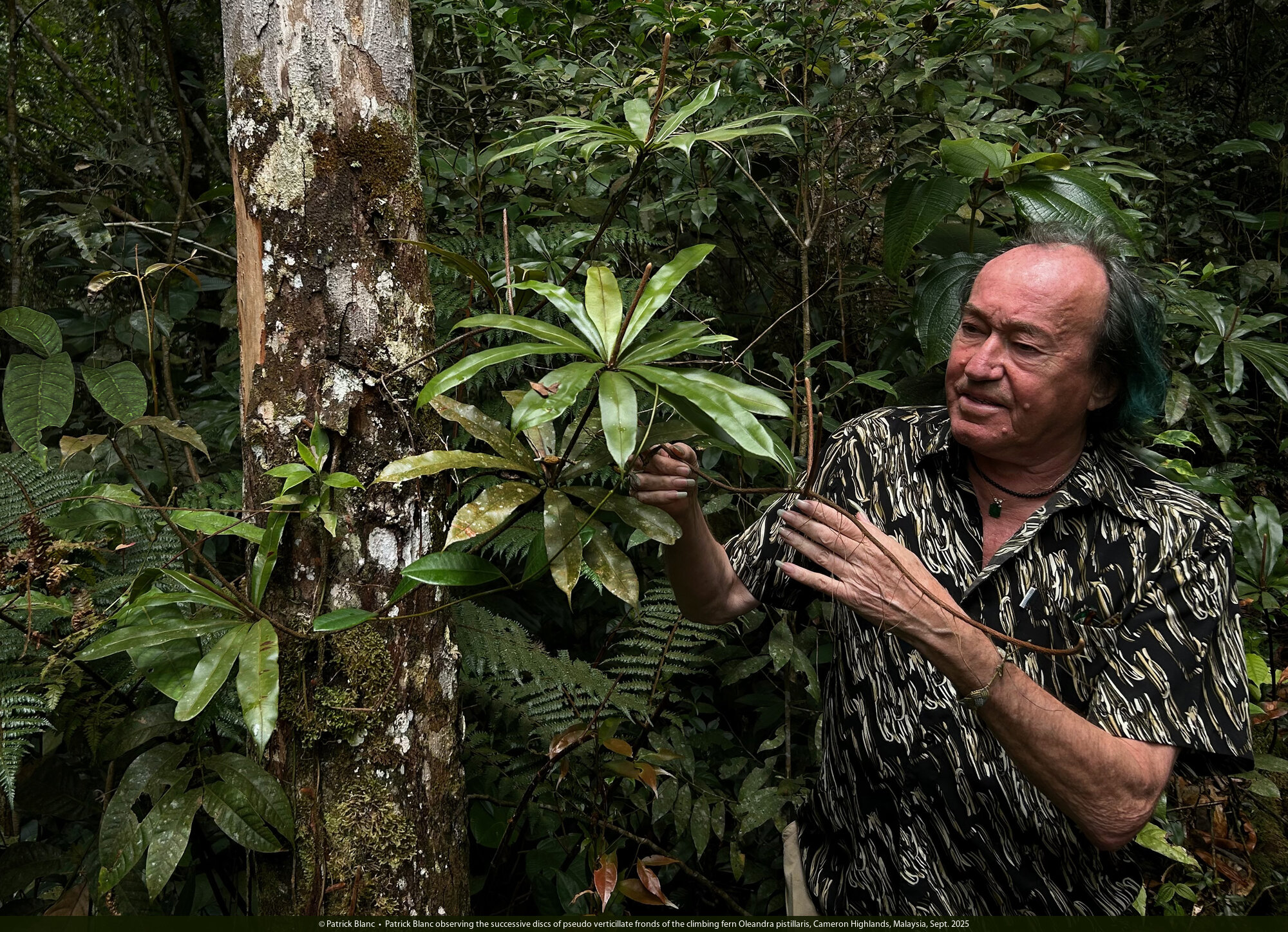 • Patrick Blanc observing the successive discs of pseudo verticillate fronds of the climbing fern Oleandra pistillaris, Cameron Highlands, Malaysia, Sept. 2025