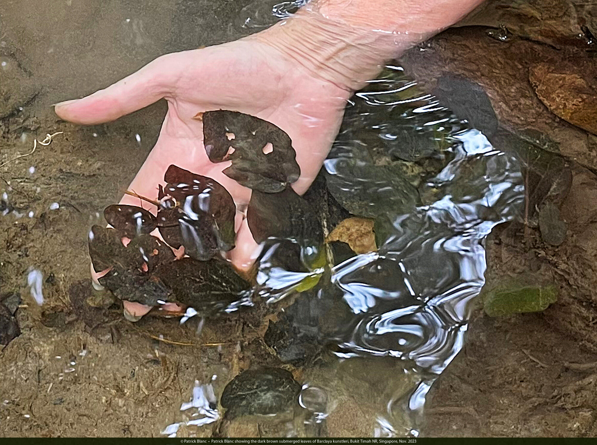 Patrick Blanc showing the dark brown submerged leaves of Barclaya kunstleri, Bukit Timah NR, Singapore, Nov. 2023