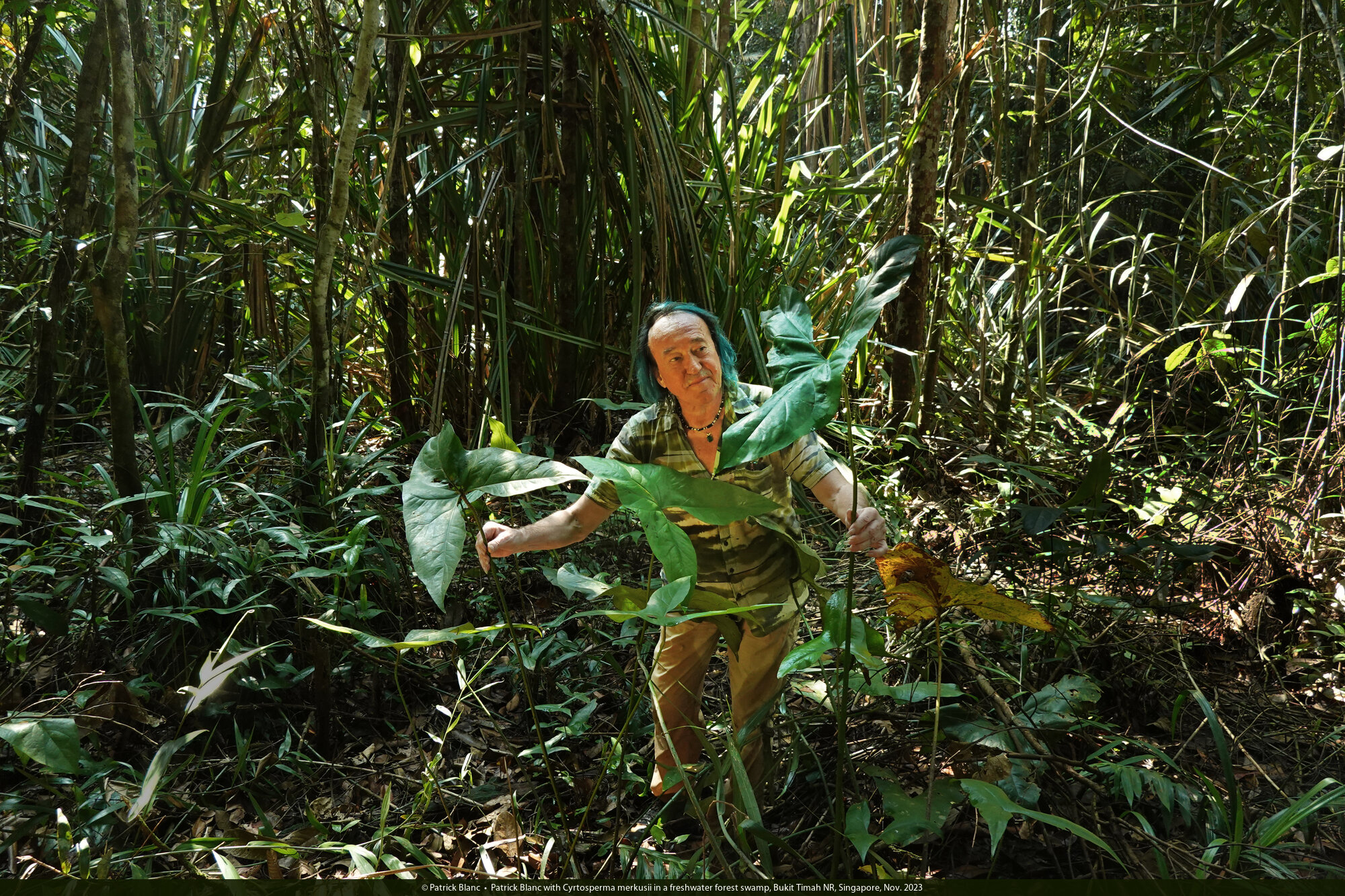 Patrick Blanc with Cyrtosperma merkusii in a freshwater forest swamp, Bukit Timah NR, Singapore, Nov. 2023
