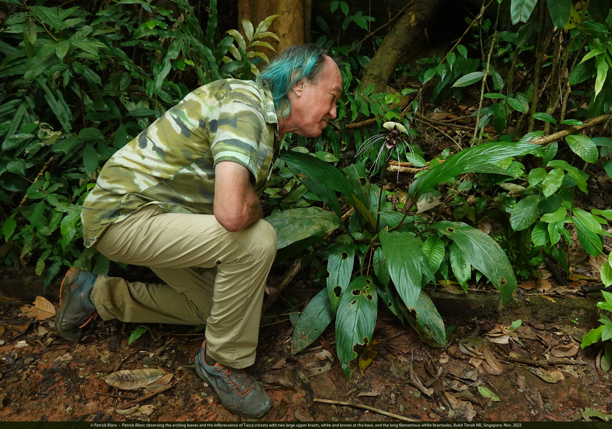 Patrick Blanc observing the arching leaves and the inflorescence of Tacca cristata with two large upper bracts, white and brown at the base, and the long filamentous white bracteoles, Bukit Timah NR, Singapore, Nov. 2023