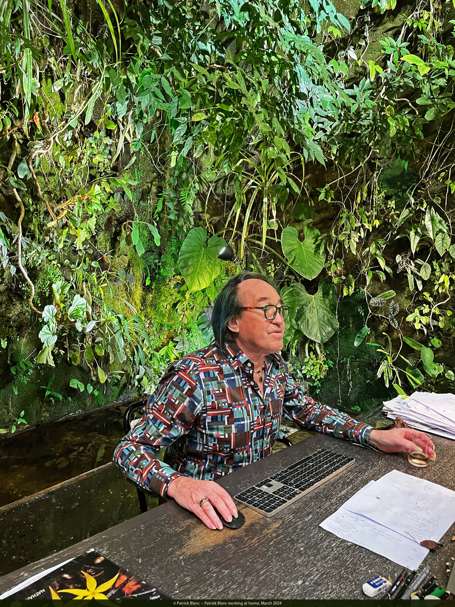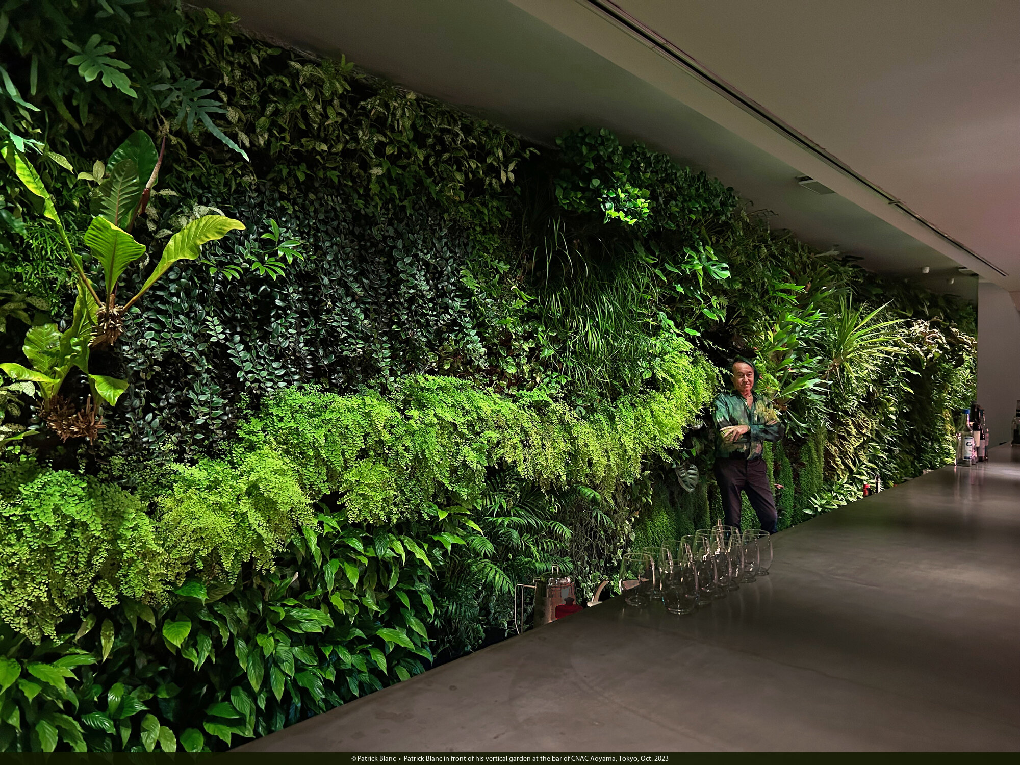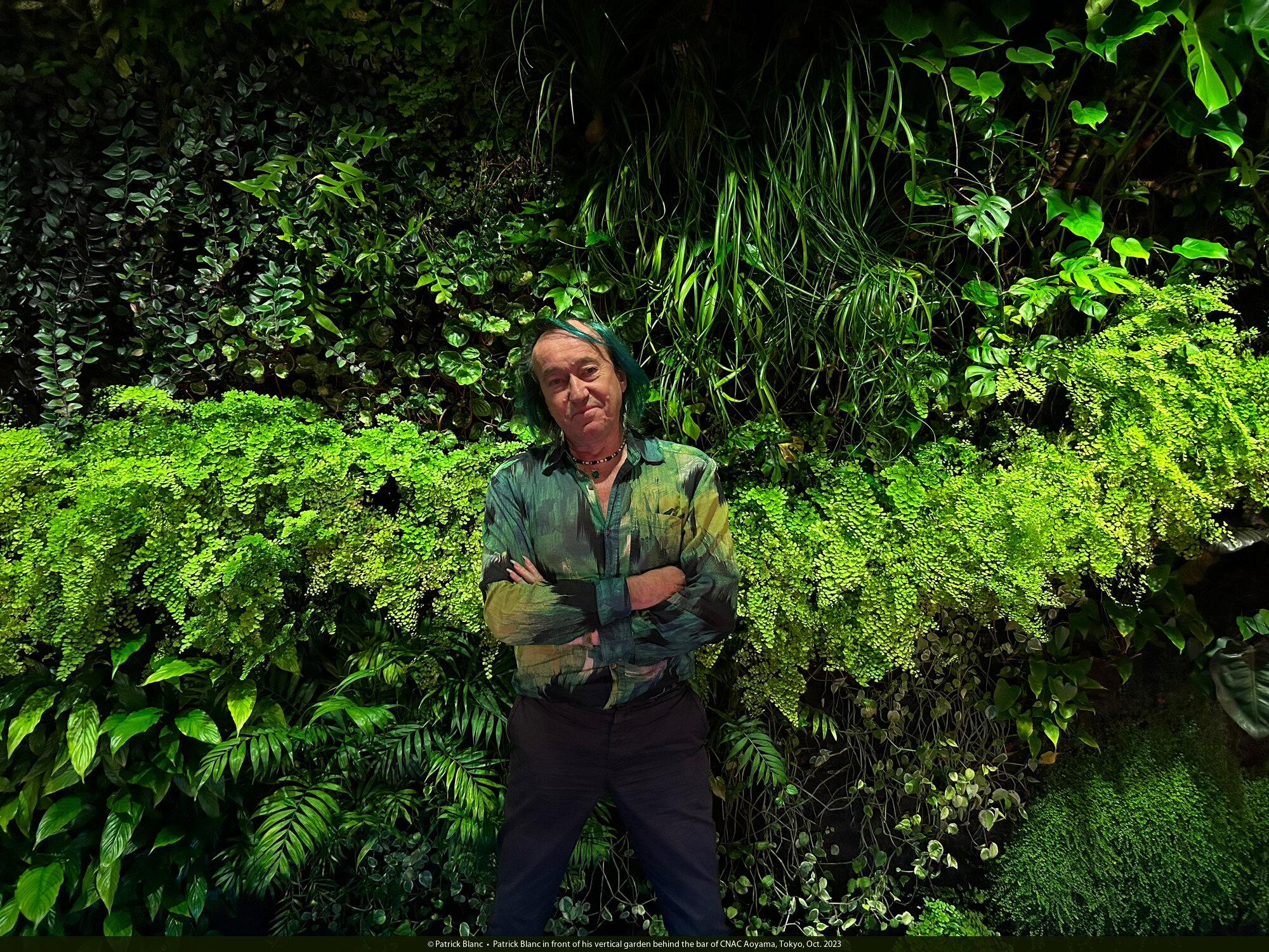 Patrick Blanc in front of his vertical garden at the bar of CNAC Aoyama, Tokyo, Oct. 2023