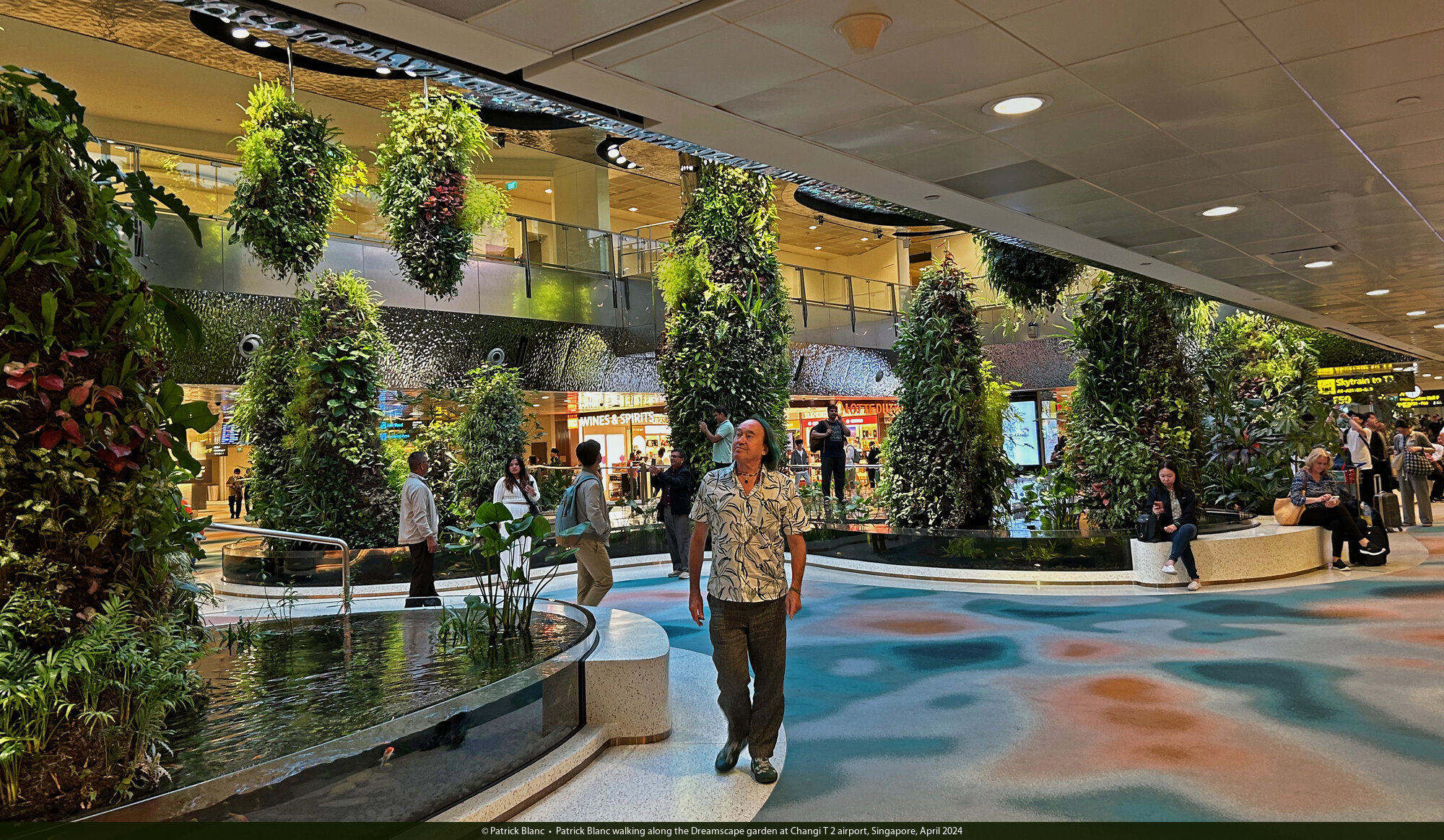 Patrick Blanc walking along the Dreamscape garden at Changi T 2 airport, Singapore, April 2024