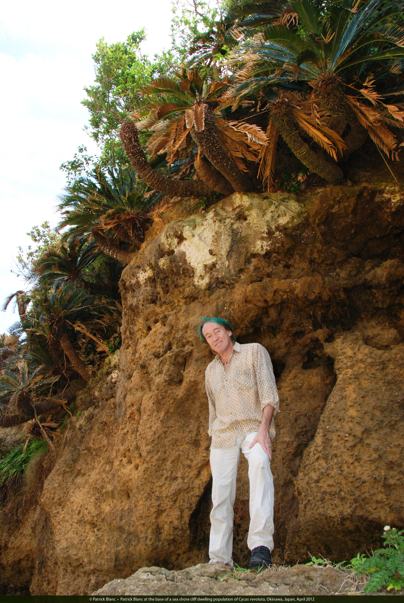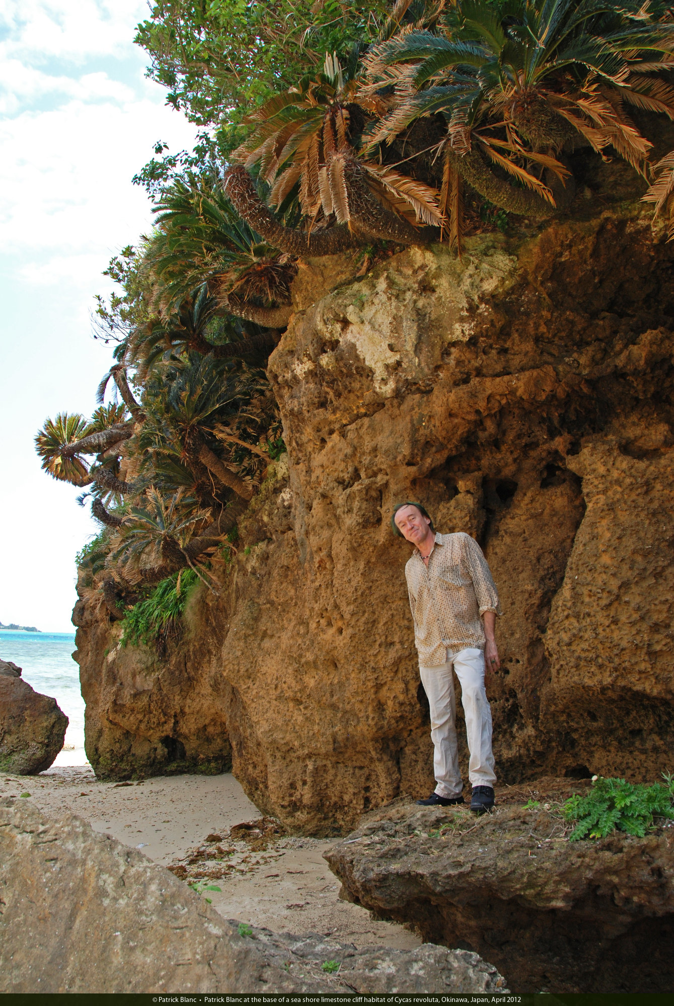 Patrick Blanc at the base of a sea shore cliff dwelling population of Cycas revoluta, Okinawa, Japan, April 2012