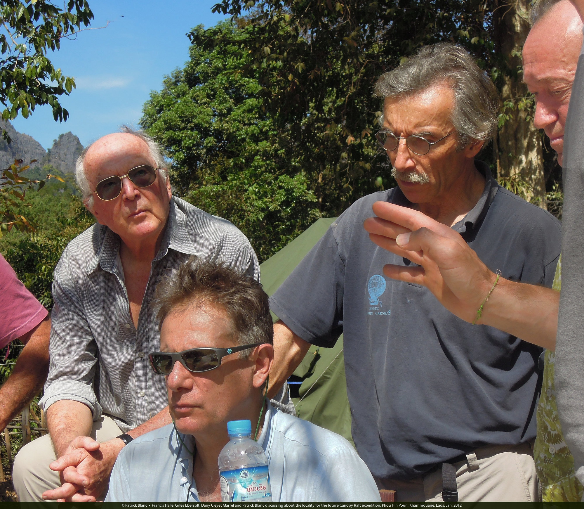 Francis Hallé, Gilles Ebersolt, Dany Cleyet Marrel and Patrick Blanc discussing about the locality for the future Canopy Raft expedition, Phou Hin Poun, Khammouane, Laos, Jan. 2012
