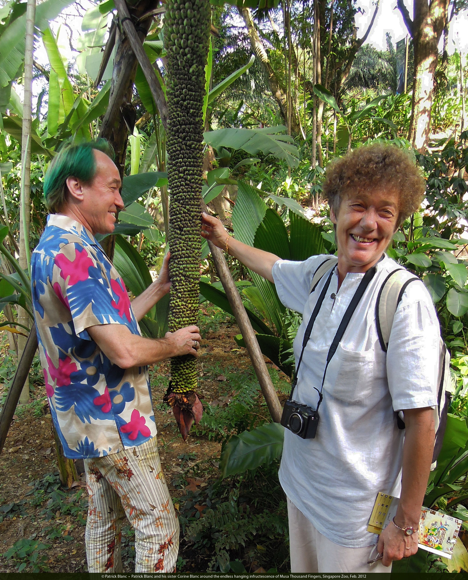 Patrick Blanc and his sister Corine Blanc around the endless hanging infructescence of Musa Thousand Fingers, Singapore Zoo, Feb. 2012