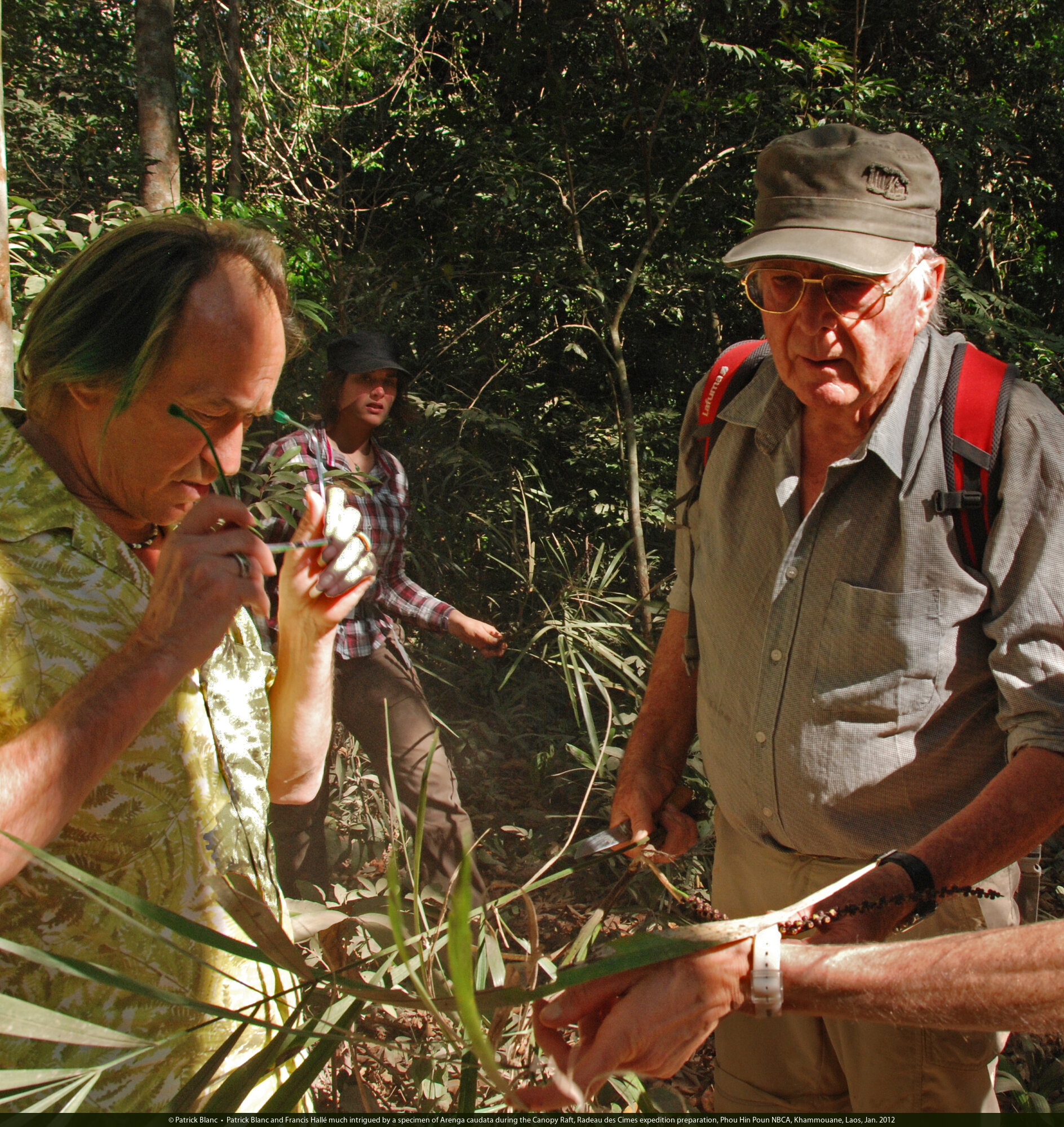 Patrick Blanc and Francis Hallé observing an Arenga caudata sample, Khonglor, Laos, Janvier 2012