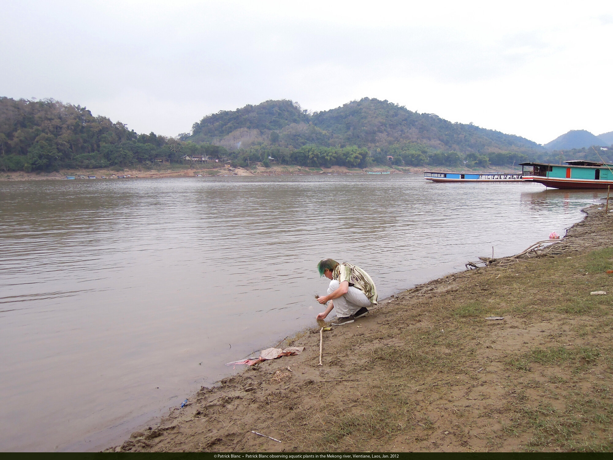 Patrick Blanc observing aquatic plants in the Mekong river, Vientiane, Laos, Jan. 2012
