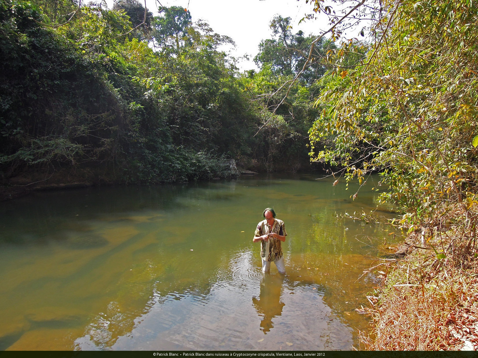Patrick Blanc dans ruisseau à Cryptocoryne crispatula, Vientiane, Laos, Janvier 2012