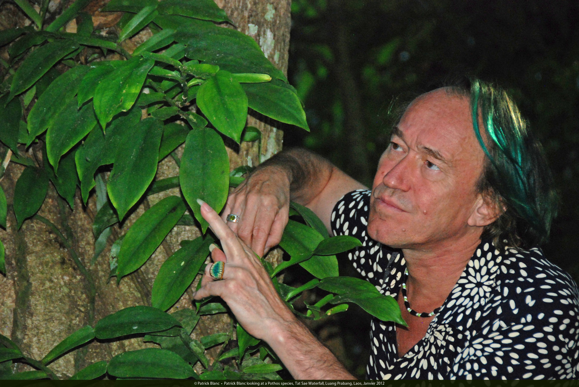 Patrick Blanc looking at a Pothos species, Tat Sae Waterfall, Luang Prabang, Laos, Janvier 2012