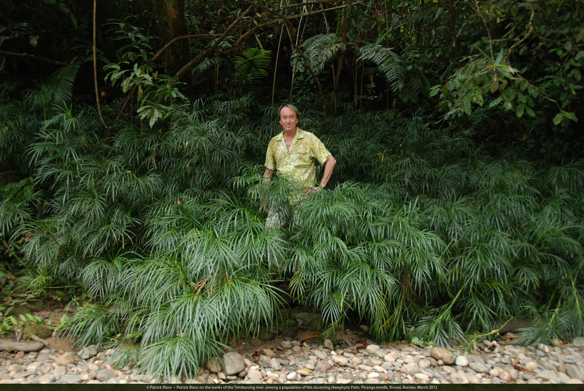 Patrick Blanc on the banks of the Temburong river, among a population of the clustering rheophytic Palm, Pinanga tenella, Brunei, Borneo, March 2012