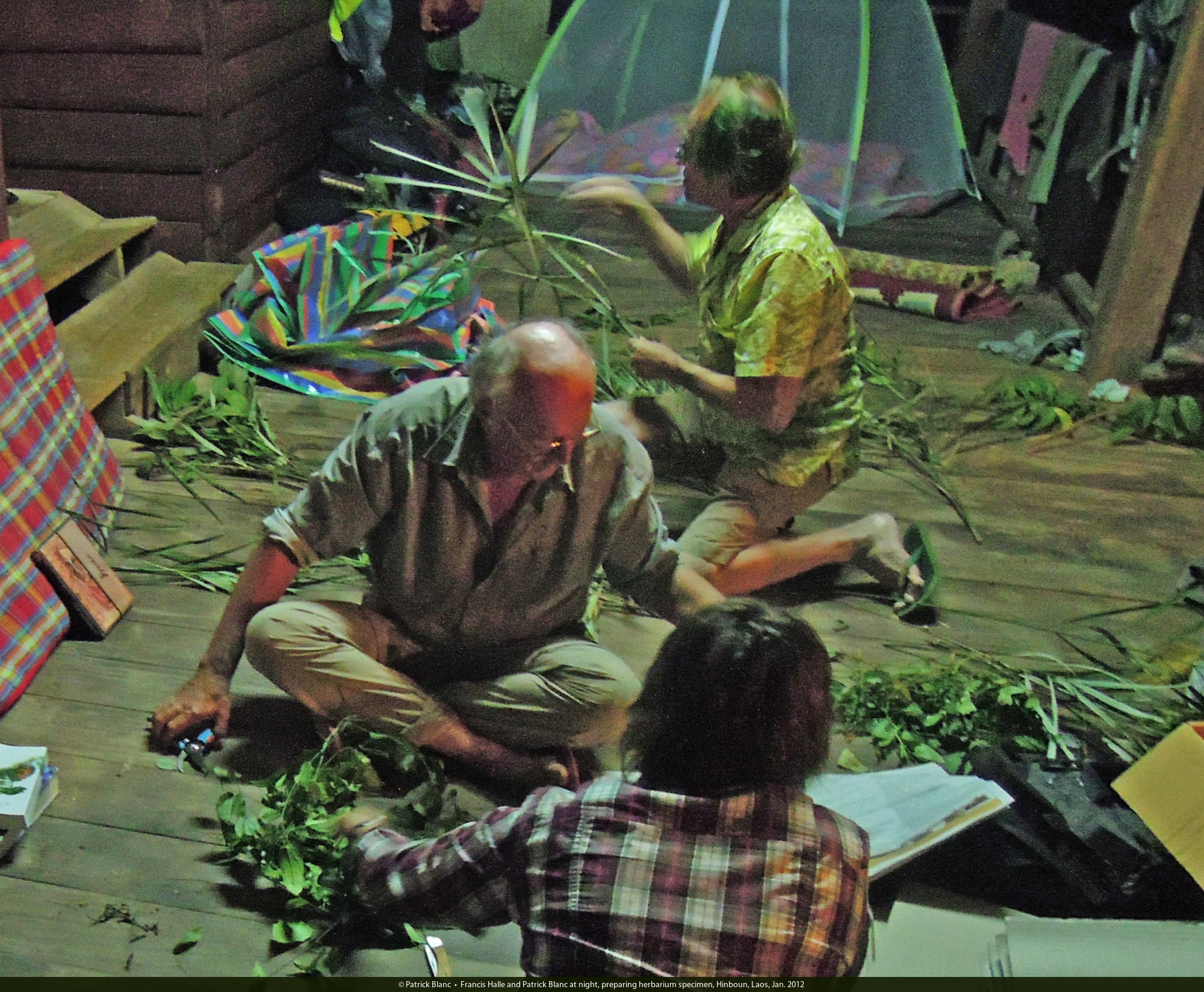 Francis Hallé and Patrick Blanc at night, preparing herbarium specimen, Hinboun, Laos, Jan. 2012