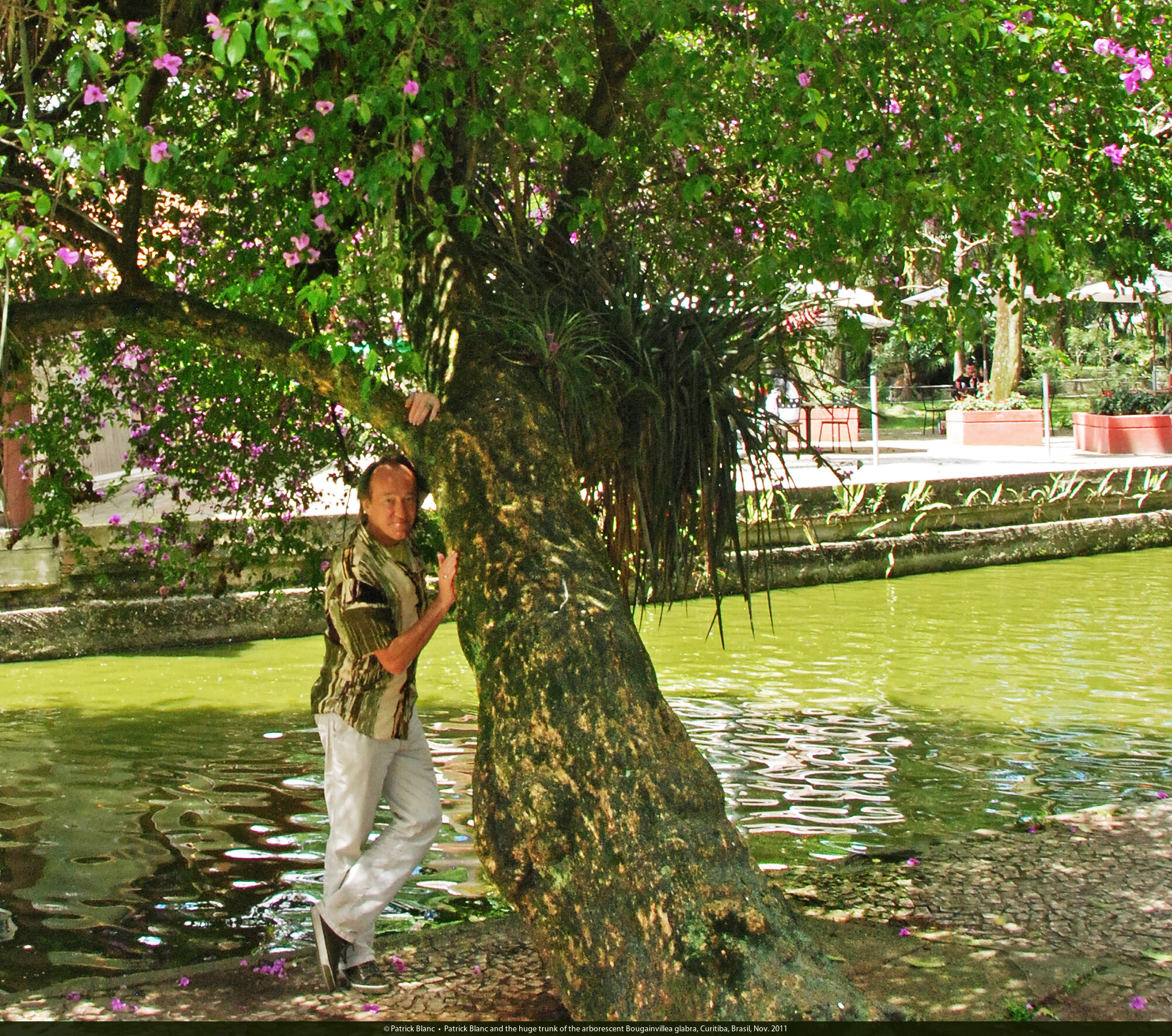 Patrick Blanc and the huge trunk of the arborescent Bougainvillea glabra, Curitiba, Brasil, Nov. 2011