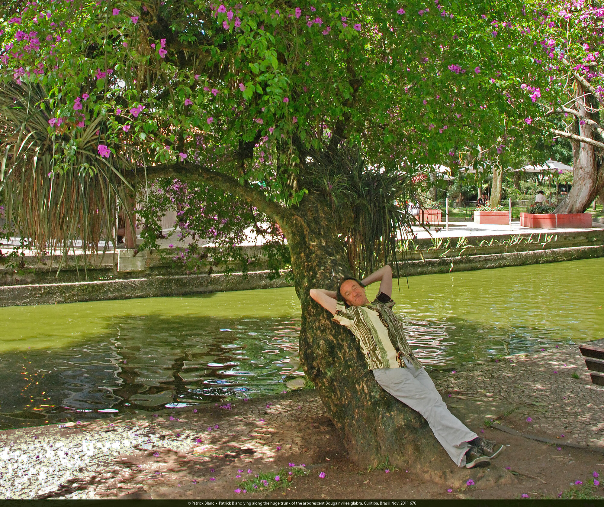Patrick Blanc lying along the huge trunk of the arborescent Bougainvillea glabra, Curitiba, Brasil, Nov. 2011 676