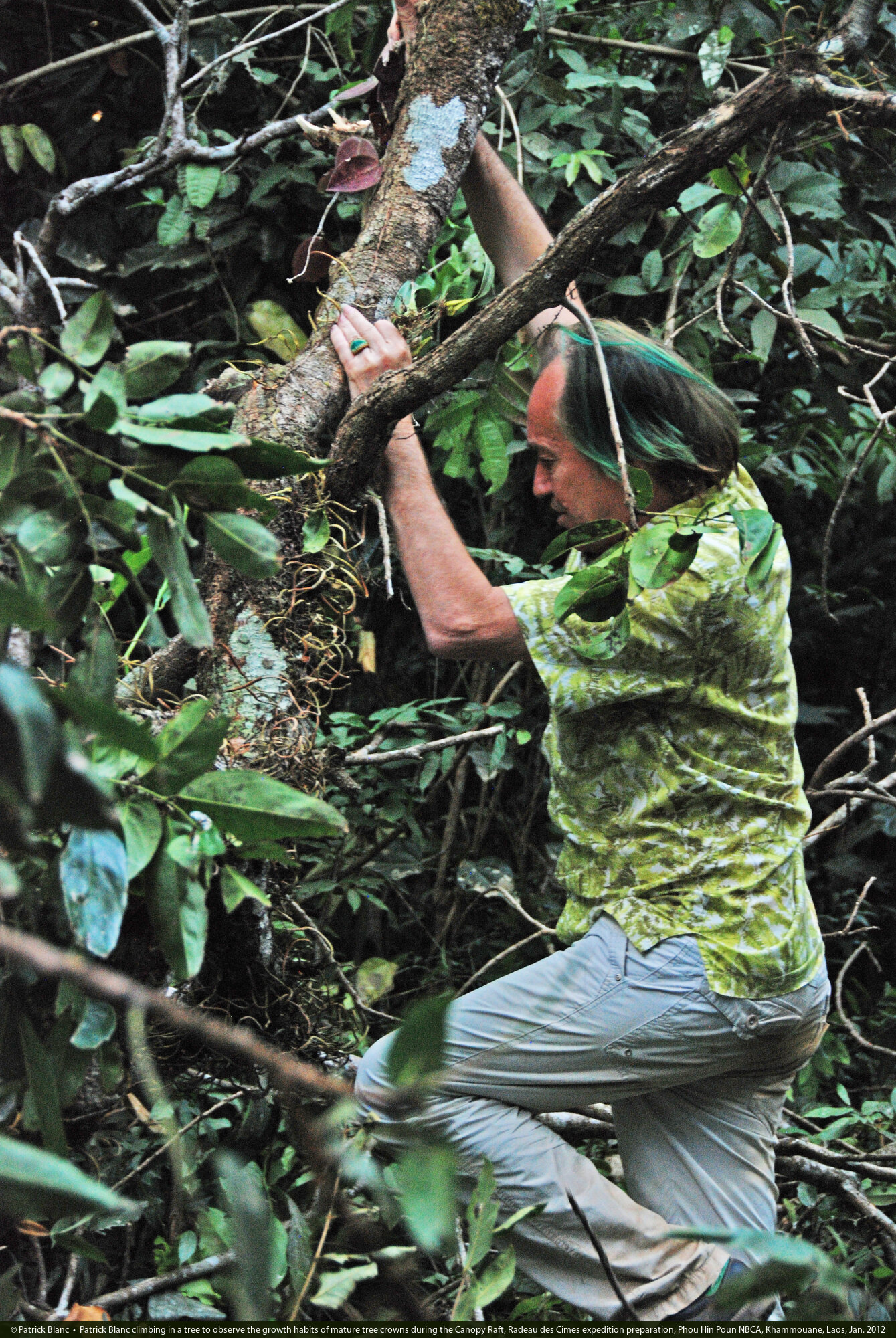 Patrick Blanc climbing in a tree to observe the growth habits of mature tree crowns during the Canopy Raft, Radeau des Cimes expedition preparation, Phou Hin Poun NBCA, Khammouane, Laos, Jan. 2012
