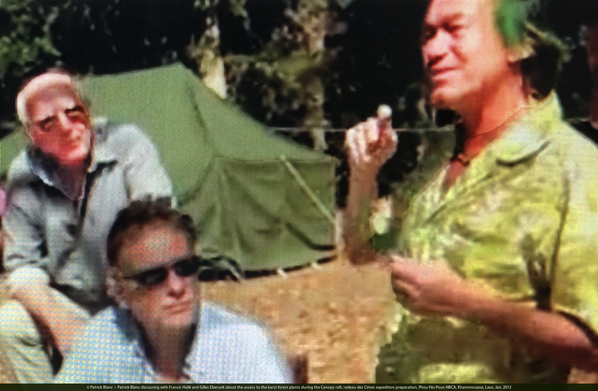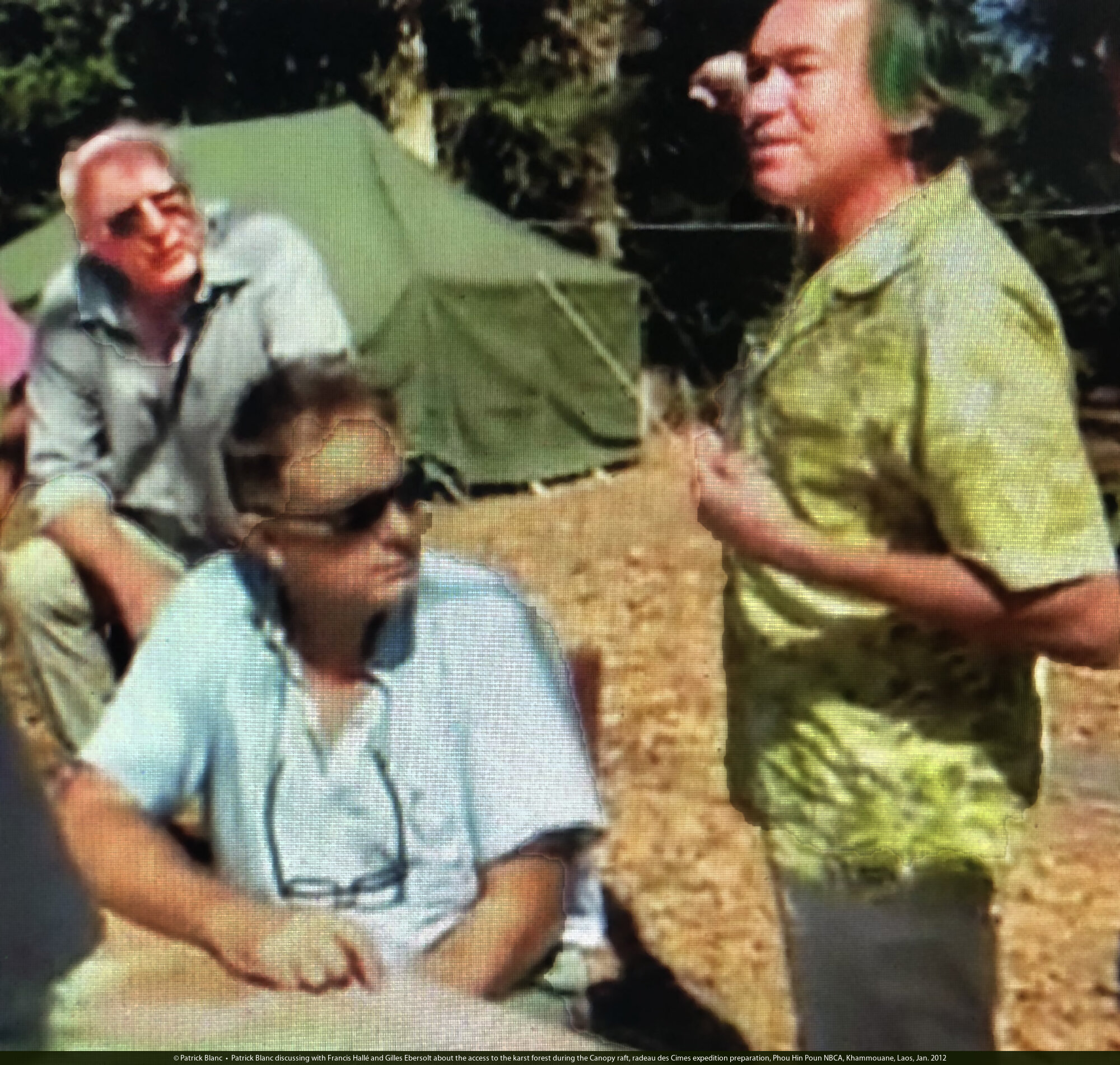 Patrick Blanc discussing with Francis Hallé and Gilles Ebersolt about the access to the karst forest during the Canopy raft, radeau des Cimes expedition preparation, Phou Hin Poun NBCA, Khammouane, Laos, Jan. 2012