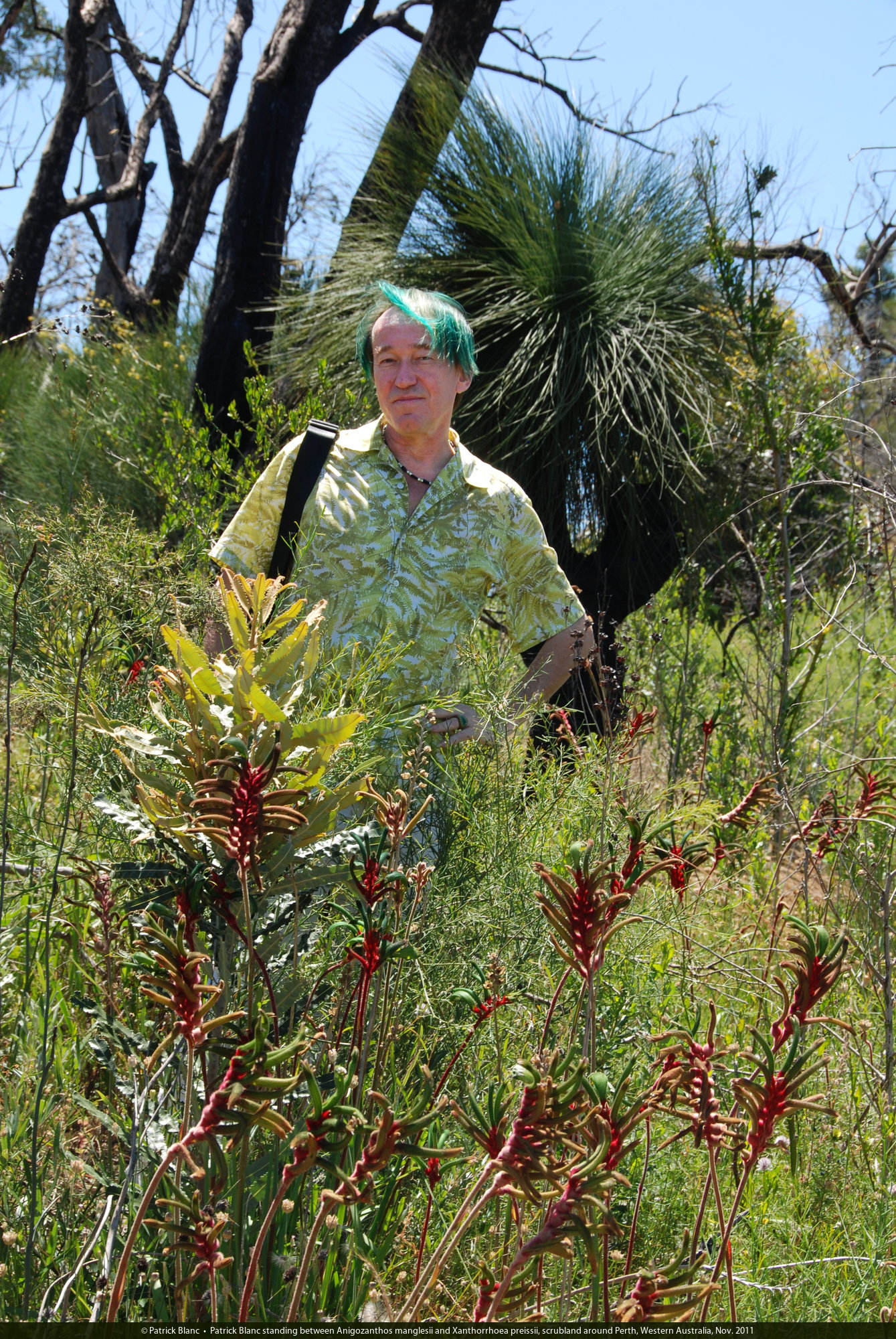Patrick Blanc standing between Anigozanthos manglesii and Xanthorrhoea preissii, scrubland around Perth, Western Australia, Nov. 2011