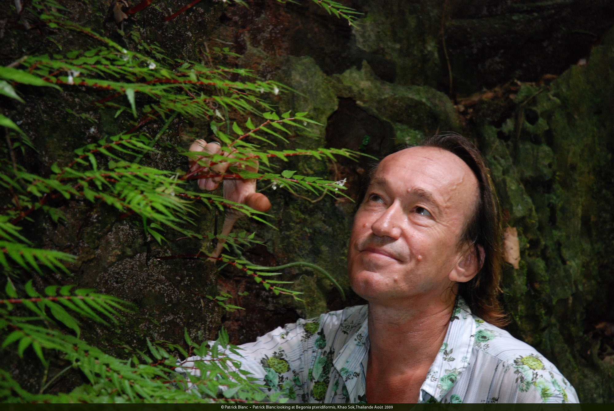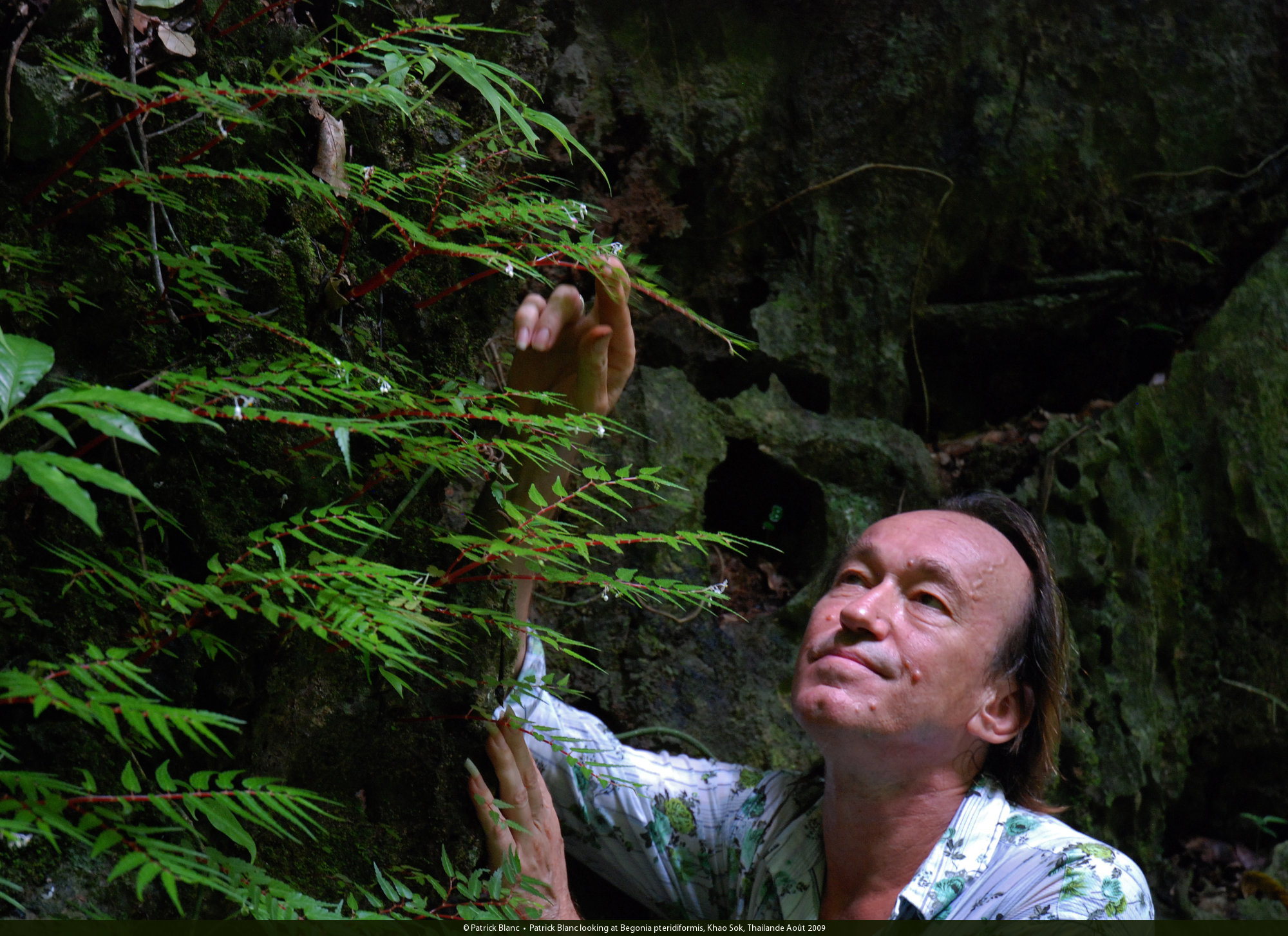 Patrick Blanc looking at Begonia pteridiformis, Khao Sok, Thailande Août 2009