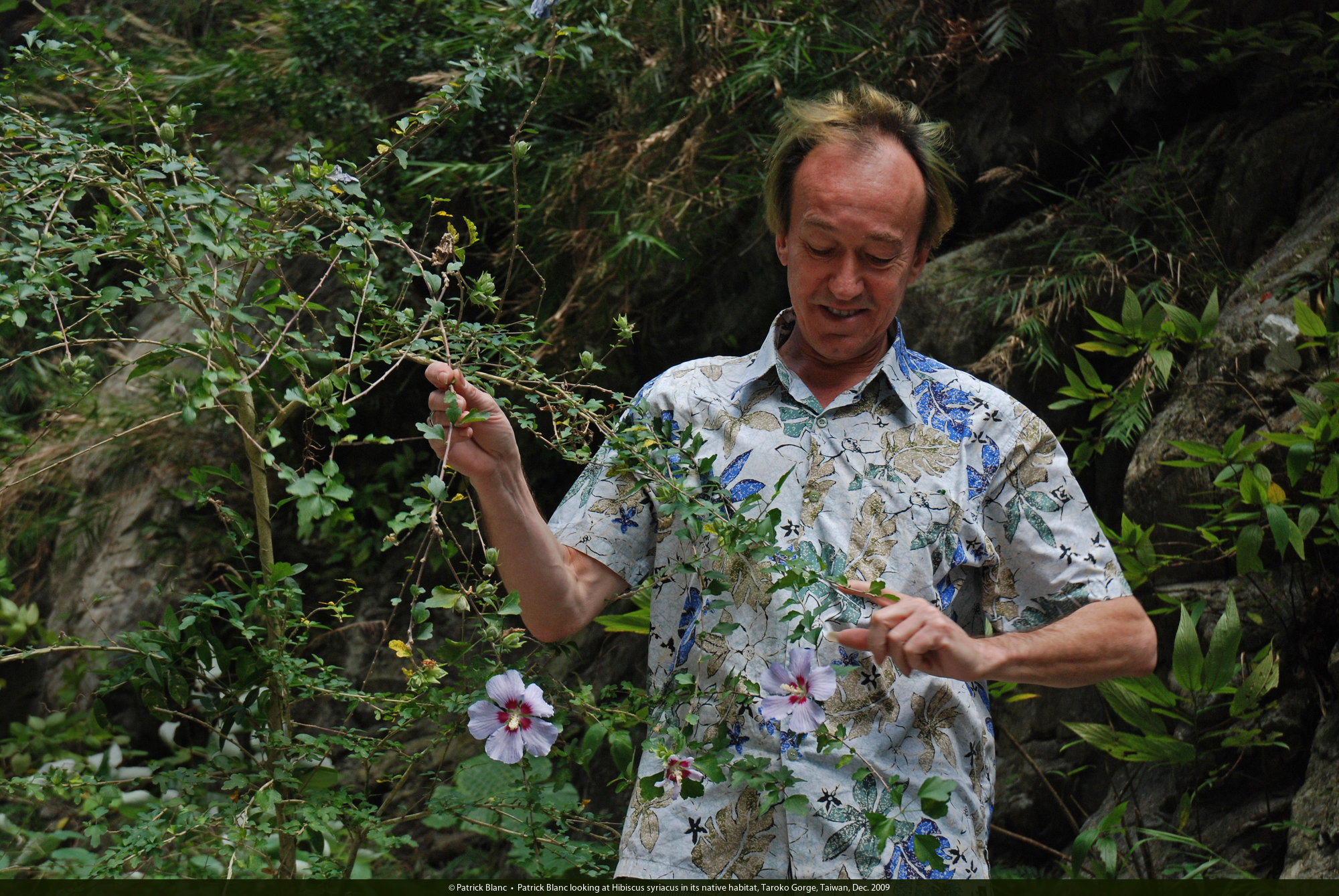 Patrick Blanc looking at Hibiscus syriacus in its native habitat, Taroko Gorge, Taiwan, Dec. 2009