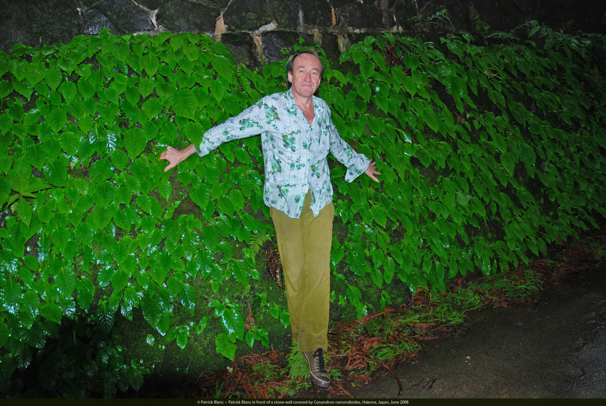 Patrick Blanc in front of a stone wall covered by Conandron ramondioides, Hakone, Japan, June 2008