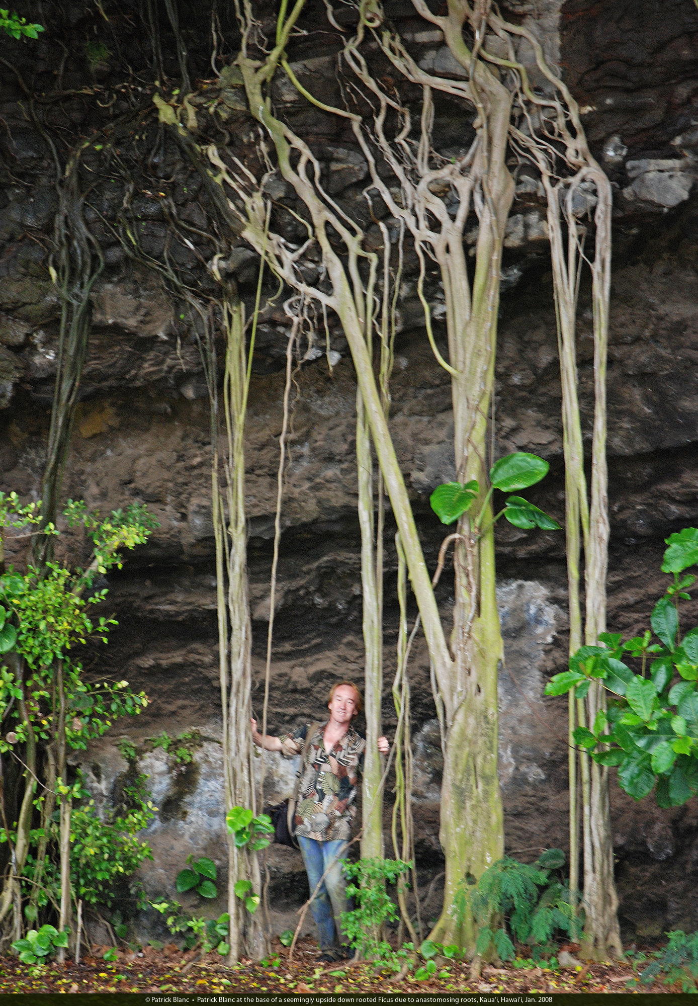 Patrick Blanc at the base of a seemingly upside down rooted Ficus due to anastomosing roots, Kaua'i, Hawai'i, Jan. 2008