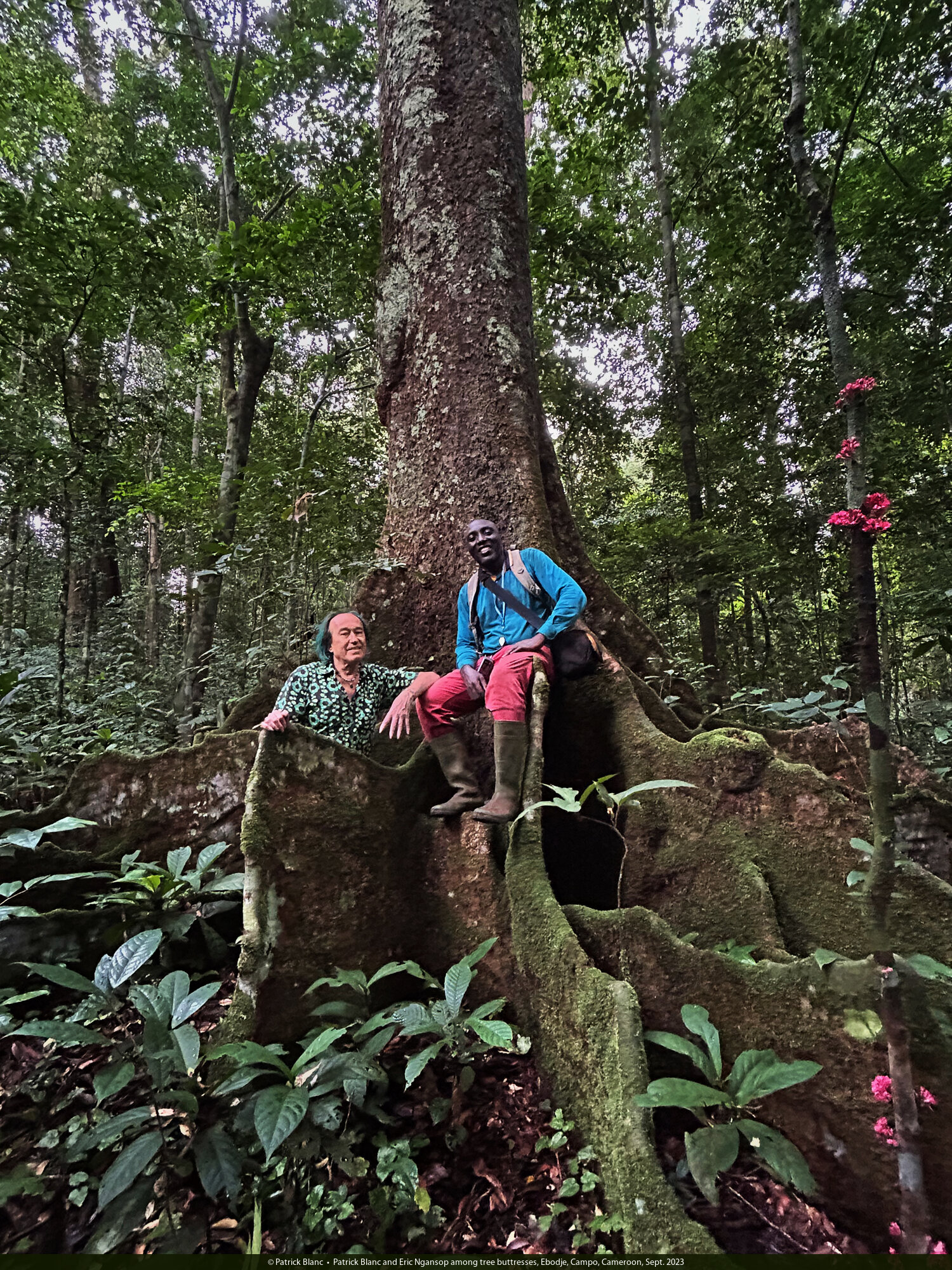 Patrick Blanc and Eric Ngansop among tree buttresses, Ebodje, Campo, Cameroon, Sept. 2023