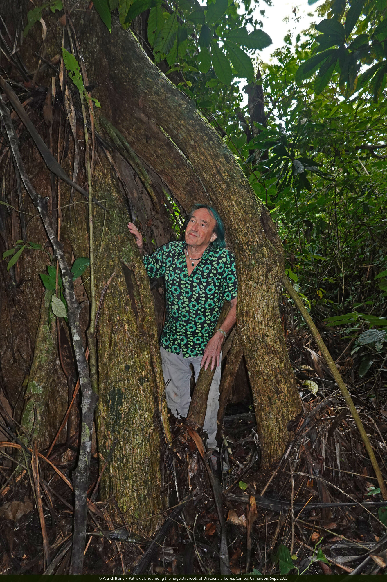 Patrick Blanc among the huge stilt roots of Dracaena arborea, Campo, Cameroon, Sept. 2023