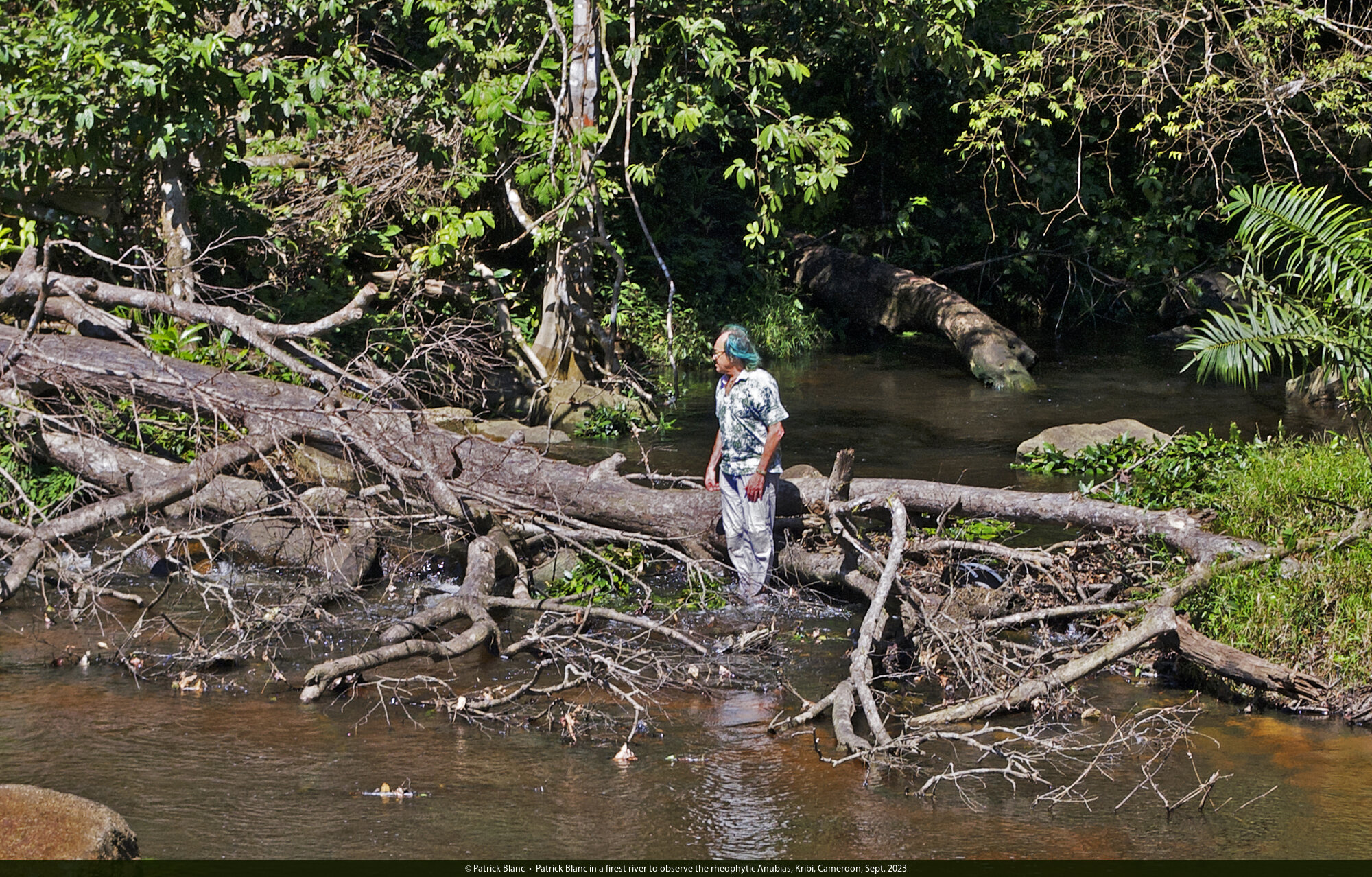Patrick Blanc in a firest river to observe the rheophytic Anubias, Kribi, Cameroon, Sept. 2023