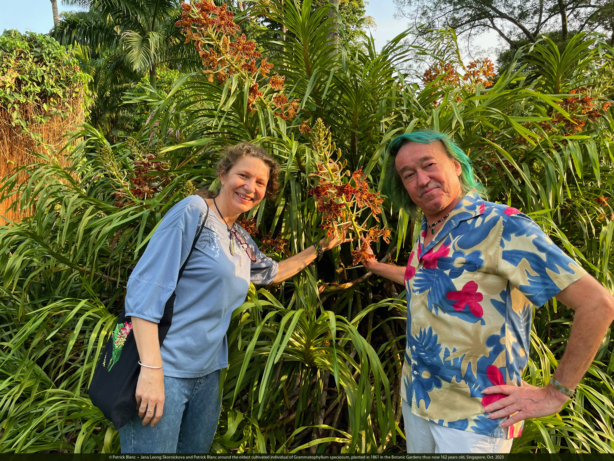 Jana Leong Skornickova and Patrick Blanc around the oldest cultivated individual of Grammatophyllum speciosum, planted in 1861 in the Botanic Gardens thus now 162 years old, Singapore, Oct. 2023