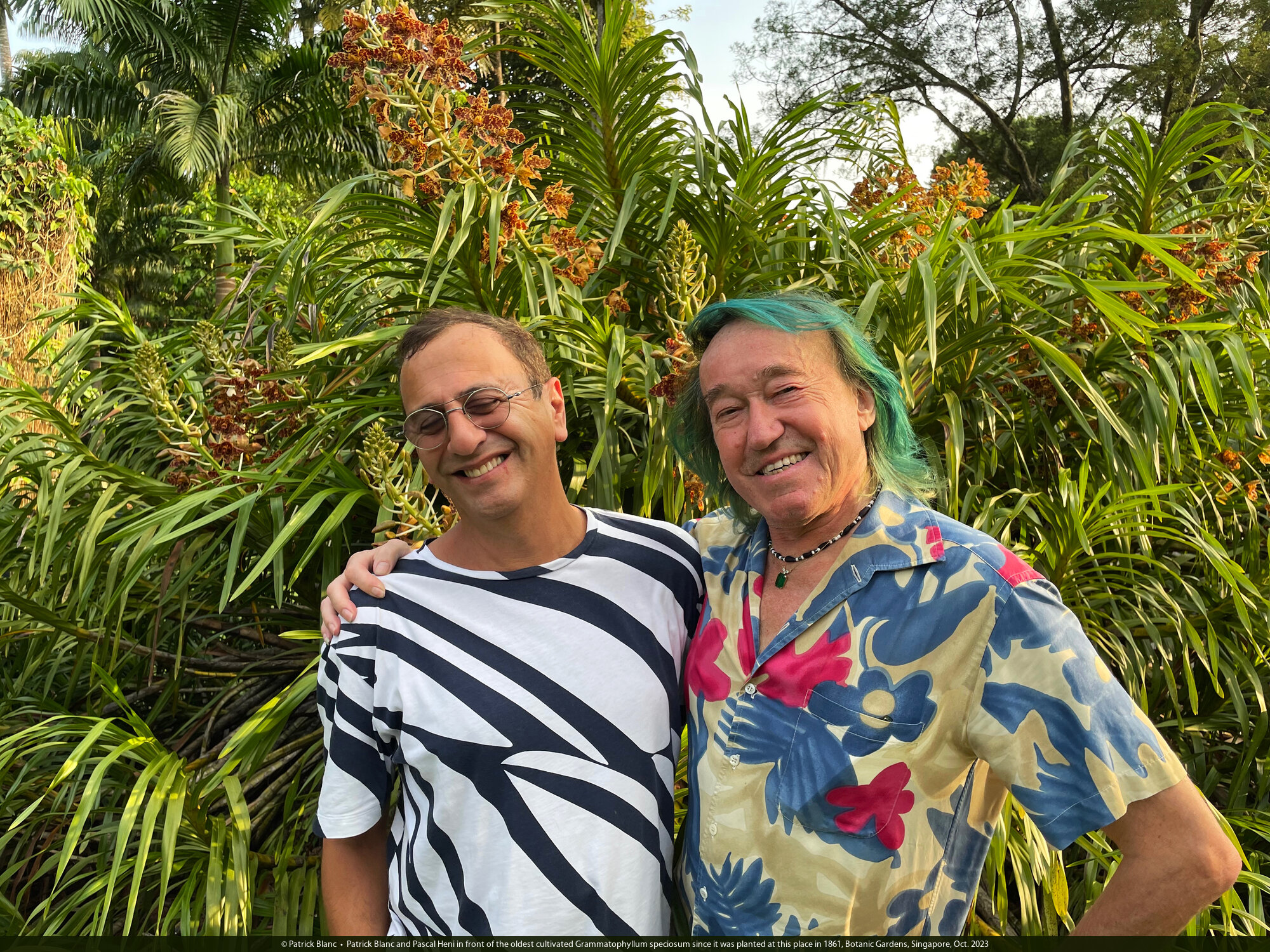 Patrick Blanc and Pascal Heni in front of the oldest cultivated Grammatophyllum speciosum since it was planted at this place in 1861, Botanic Gardens, Singapore, Oct. 2023