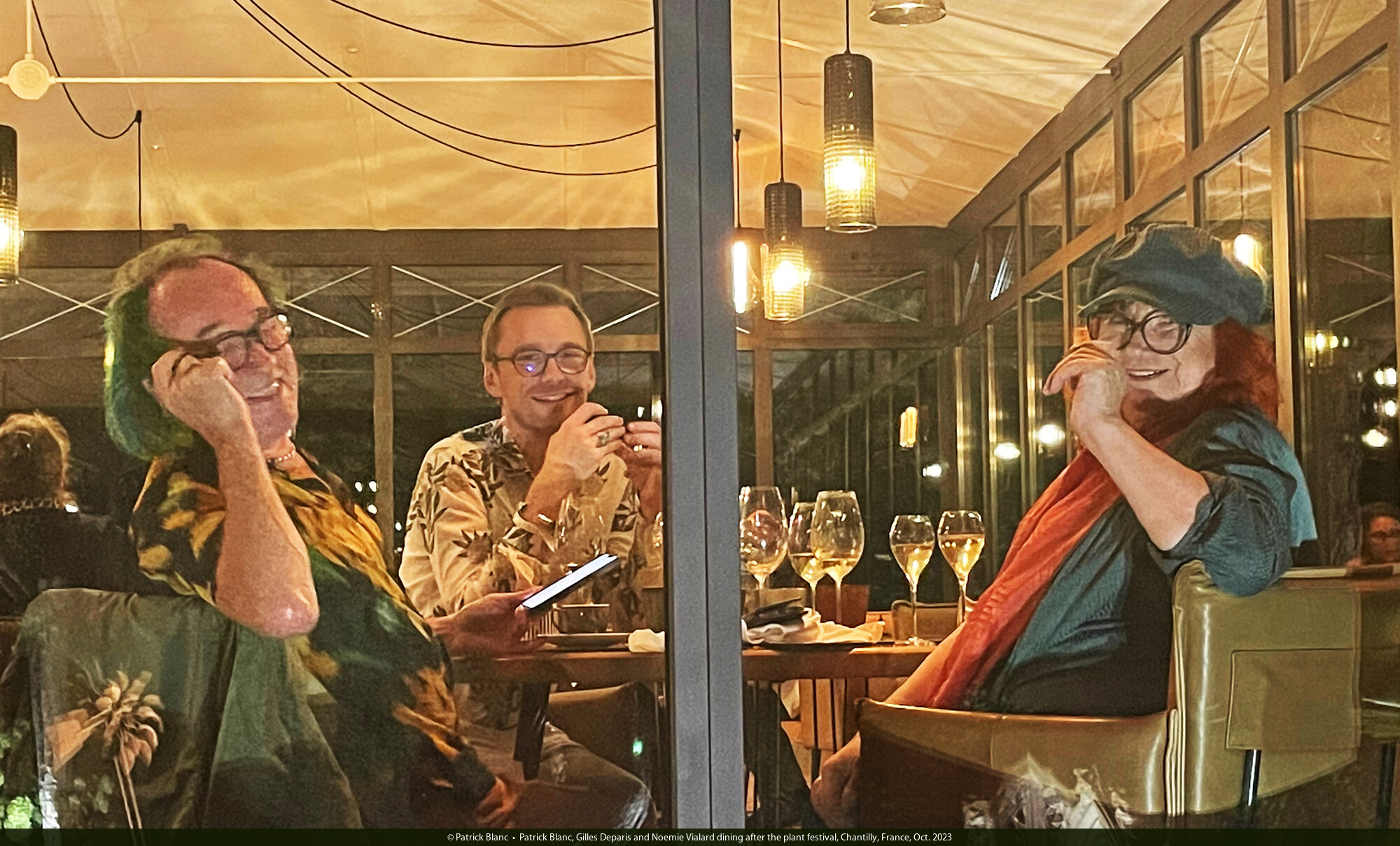 Patrick Blanc, Gilles Deparis and Noemie Vialard dining after the plant festival, Chantilly, France, Oct. 2023