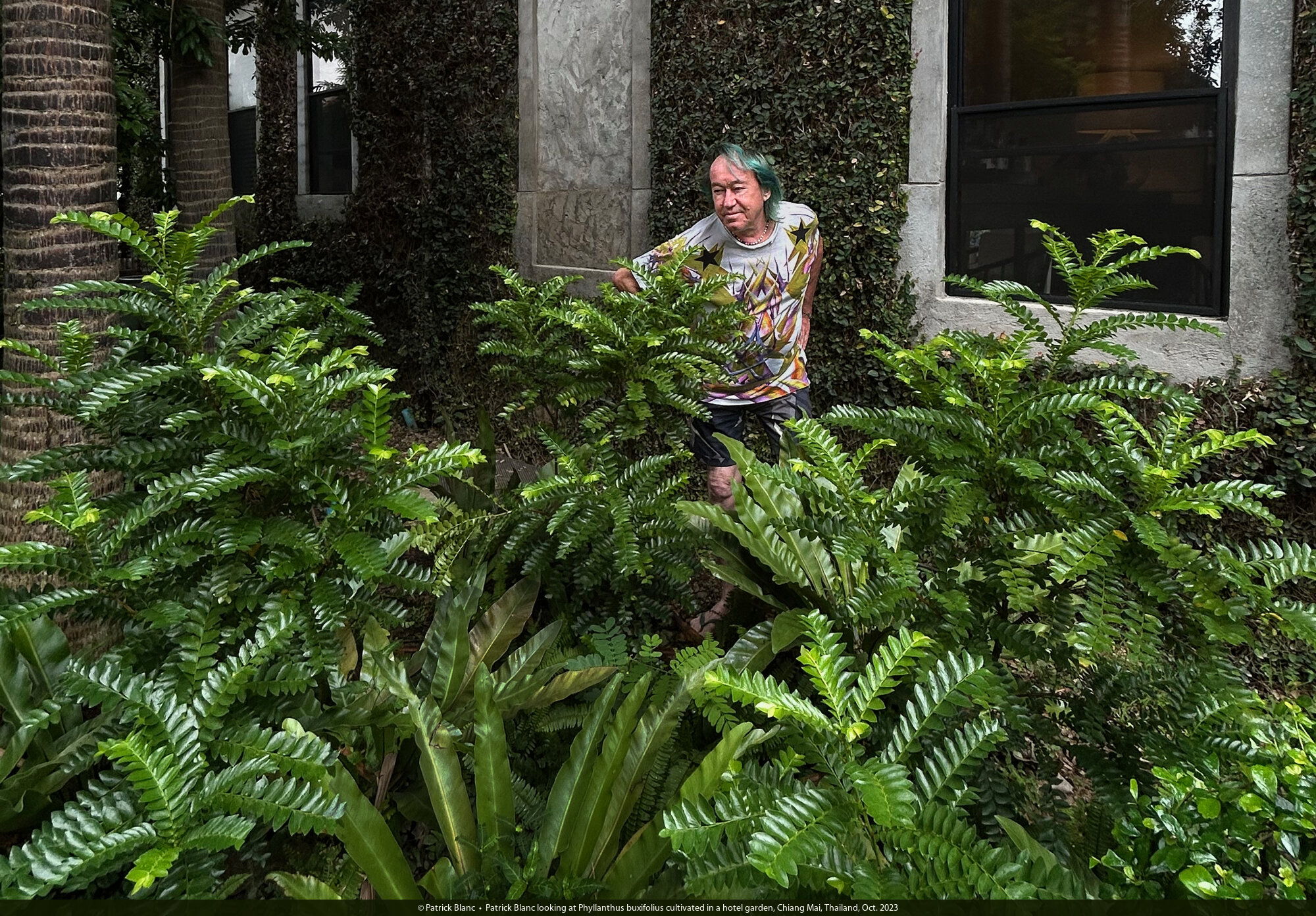 Patrick Blanc looking at Phyllanthus buxifolius cultivated in a hotel garden, Chiang Mai, Thailand, Oct. 2023