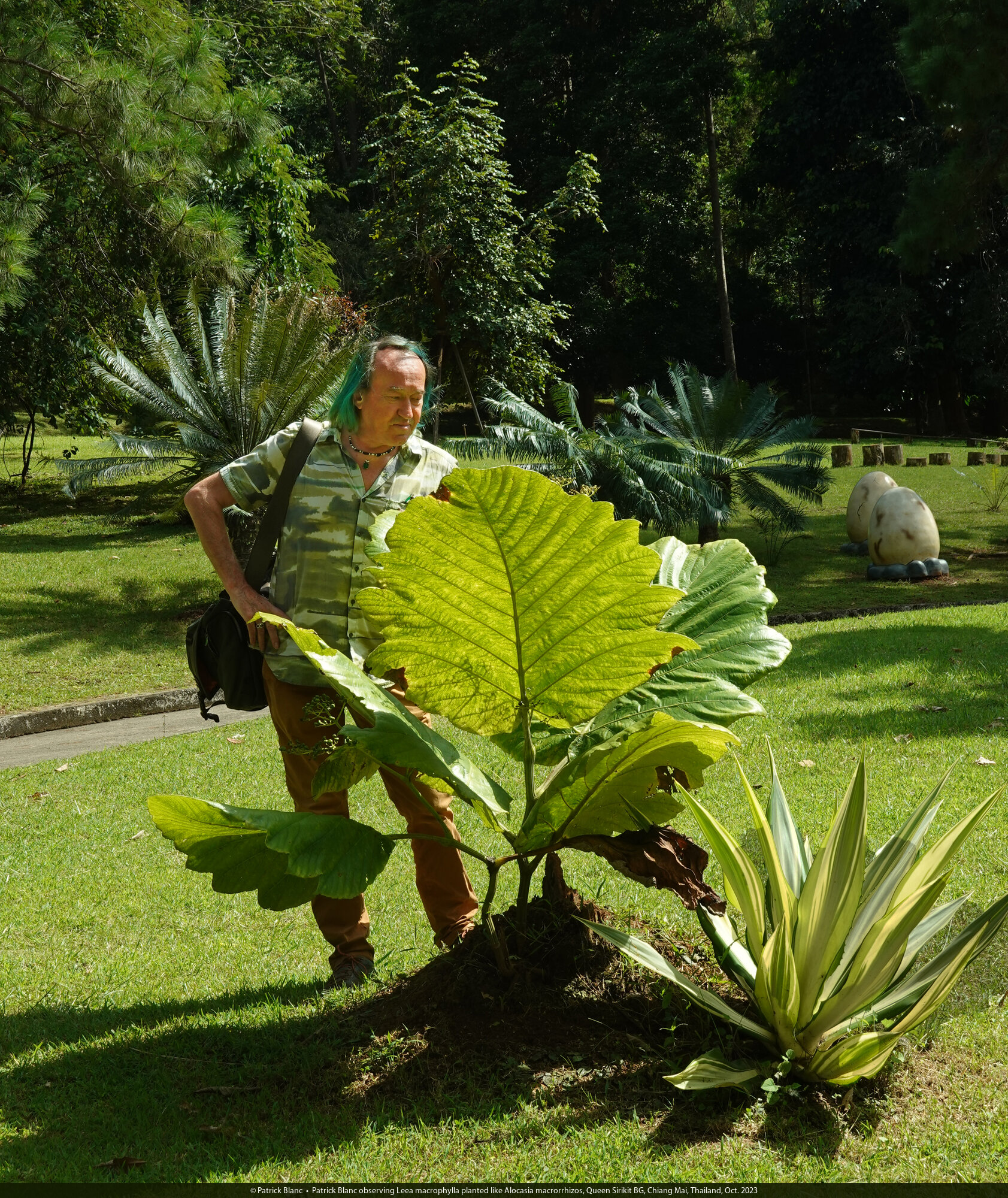Patrick Blanc observing Leea macrophylla planted like Alocasia macrorrhizos, Queen Sirikit BG, Chiang Mai, Thailand, Oct. 2023