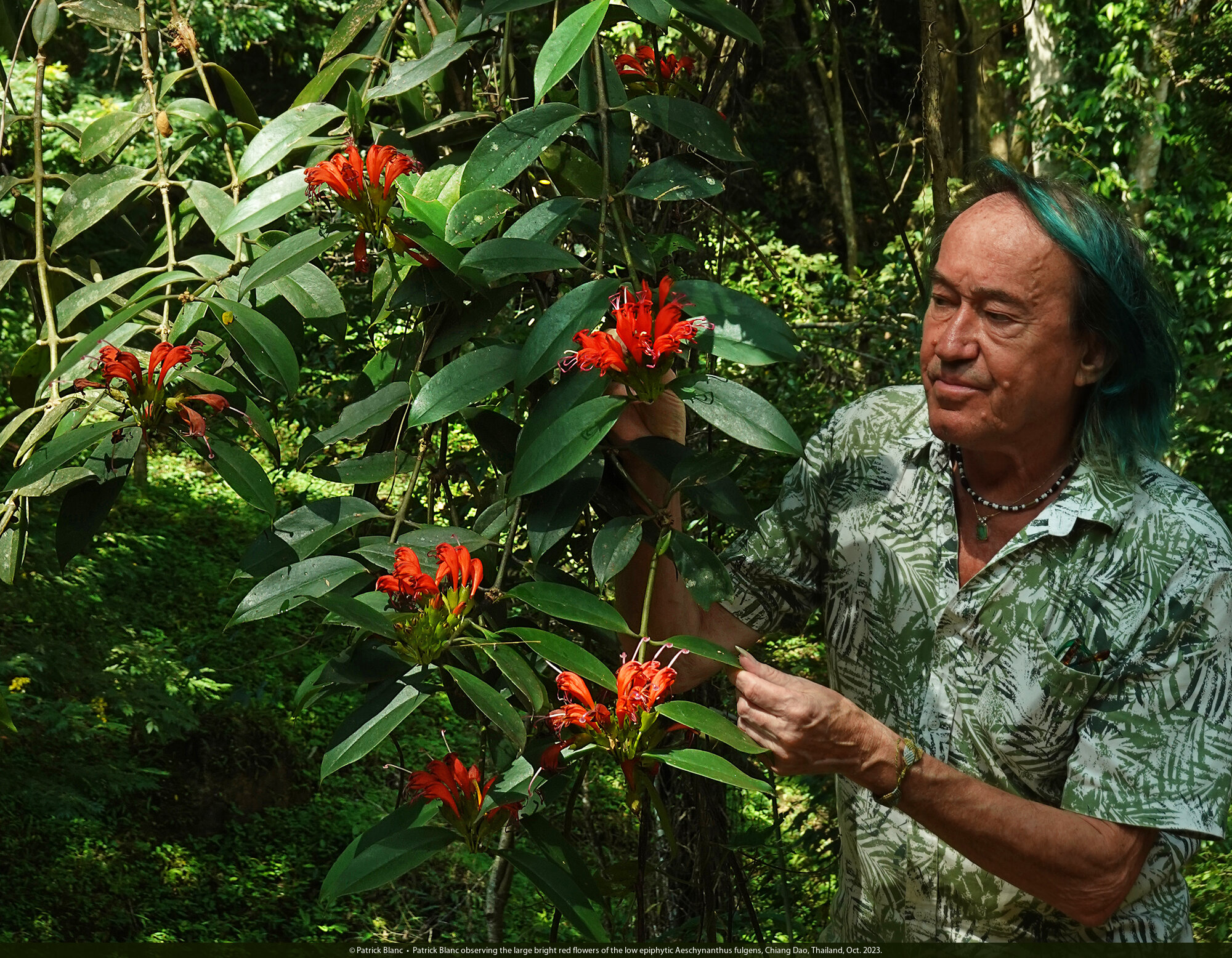 Patrick Blanc observing the large bright red flowers of the low epiphytic Aeschynanthus fulgens, Chiang Dao, Thailand, Oct. 2023.