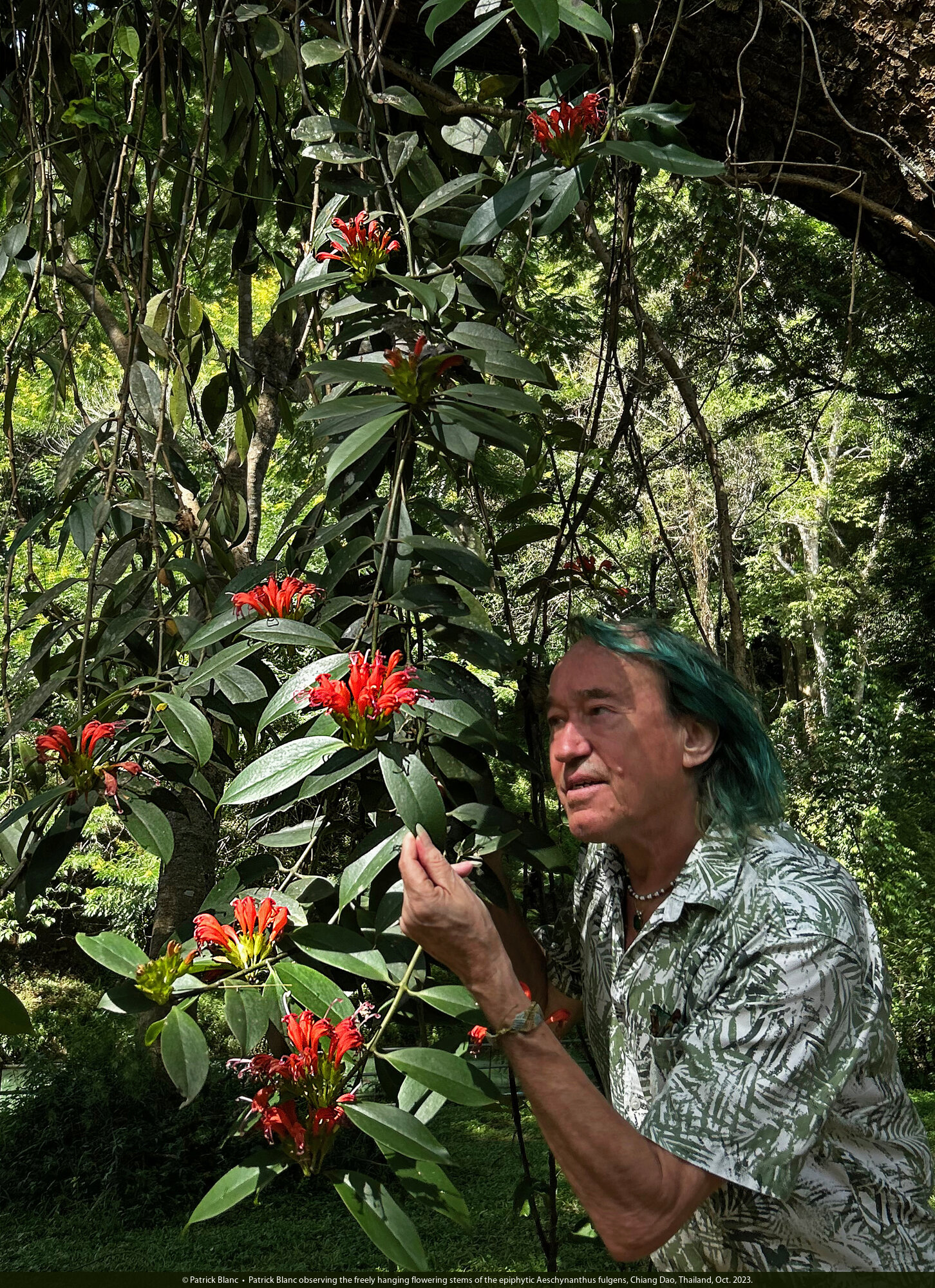 Patrick Blanc observing the freely hanging flowering stems of the epiphytic Aeschynanthus fulgens, Chiang Dao, Thailand, Oct. 2023.
