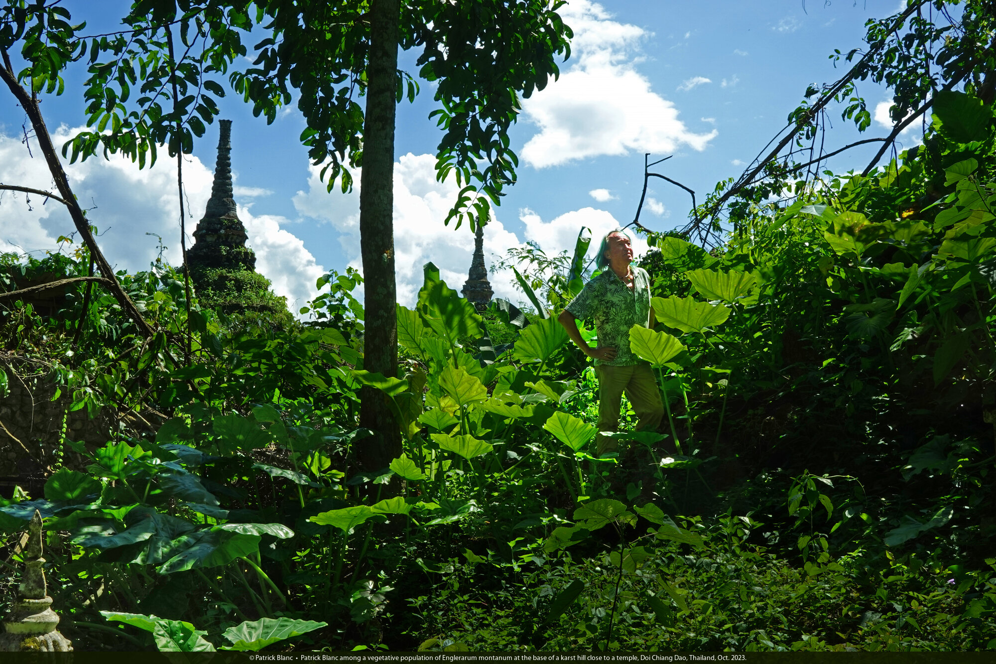 Patrick Blanc among a vegetative population of Englerarum montanum at the base of a karst hill close to a temple, Doi Chiang Dao, Thailand, Oct. 2023.