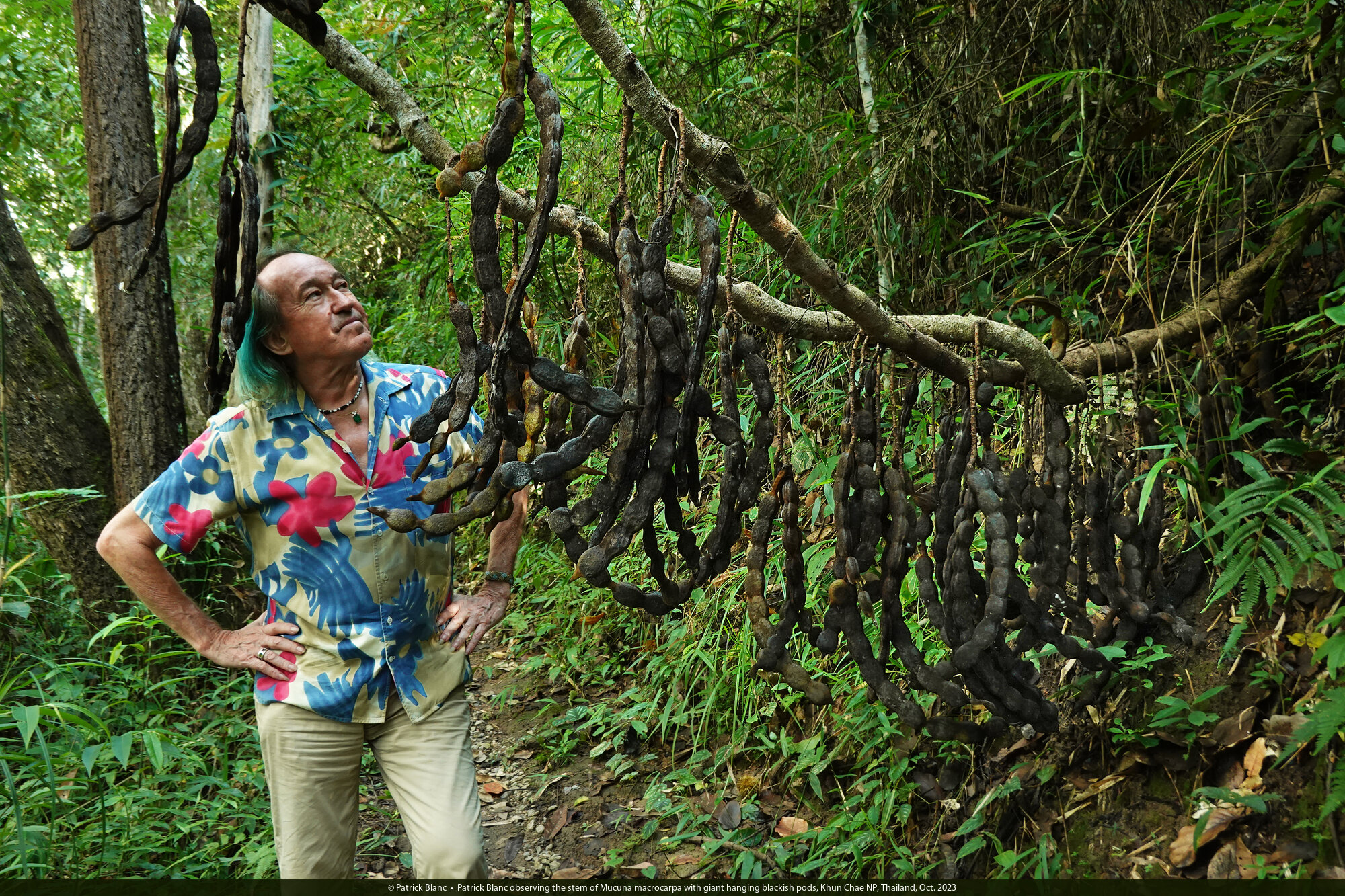 Patrick Blanc observing the stem of Mucuna macrocarpa with giant hanging blackish pods, Khun Chae NP, Thailand, Oct. 2023