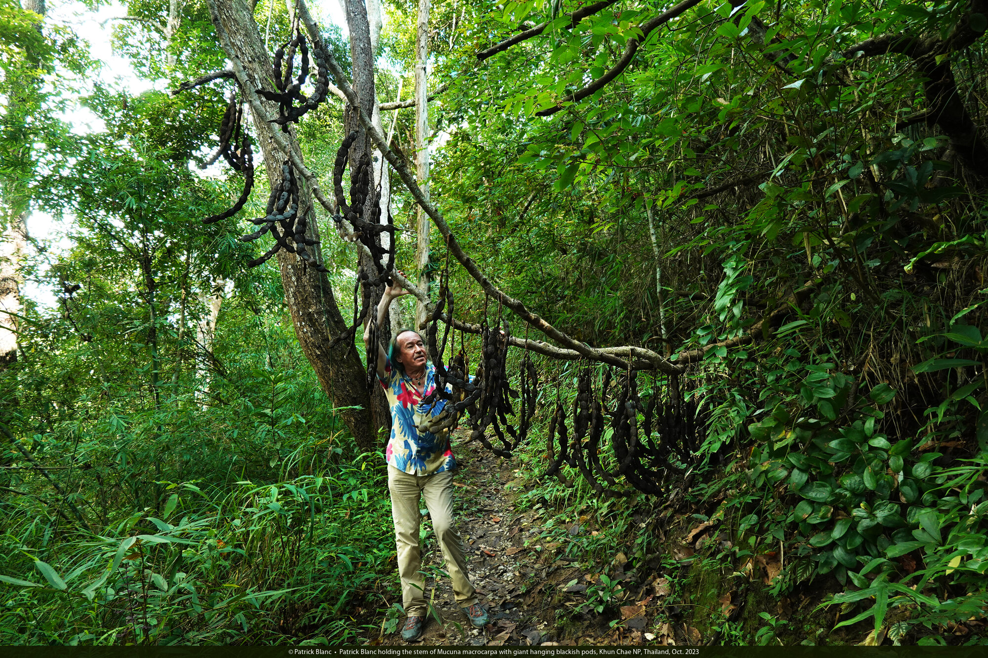 Patrick Blanc holding the stem of Mucuna macrocarpa with giant hanging blackish pods, Khun Chae NP, Thailand, Oct. 2023