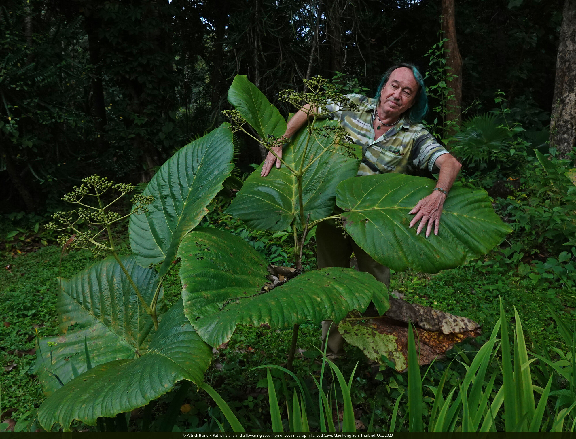 Patrick Blanc and a flowering specimen of Leea macrophylla, Lod Cave, Mae Hong Son, Thailand, Oct. 2023