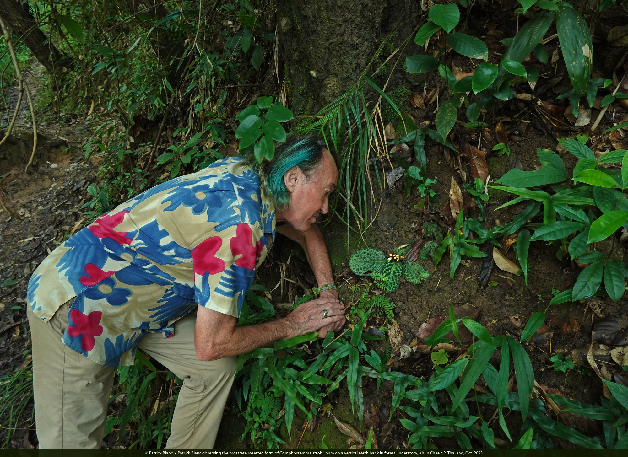 Patrick Blanc observing the prostrate rosetted form of Gomphostemma strobilinum on a vertical earth bank in forest understory, Khun Chae NP, Thailand, Oct. 2023