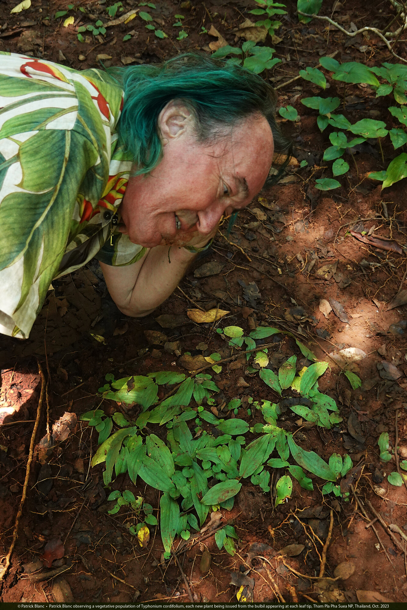 Patrick Blanc observing a vegetative population of Typhonium cordifolium, each new plant being issued from the bulbil appearing at each leaf tip, Tham Pla Pha Suea NP, Thailand, Oct. 2023