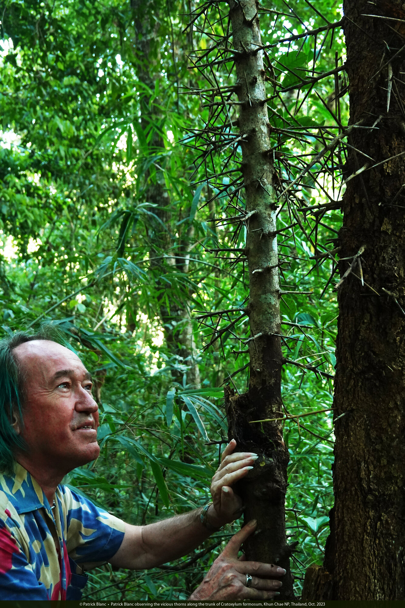 Patrick Blanc observing the vicious thorns along the trunk of Cratoxylum formosum, Khun Chae NP, Thailand, Oct. 2023