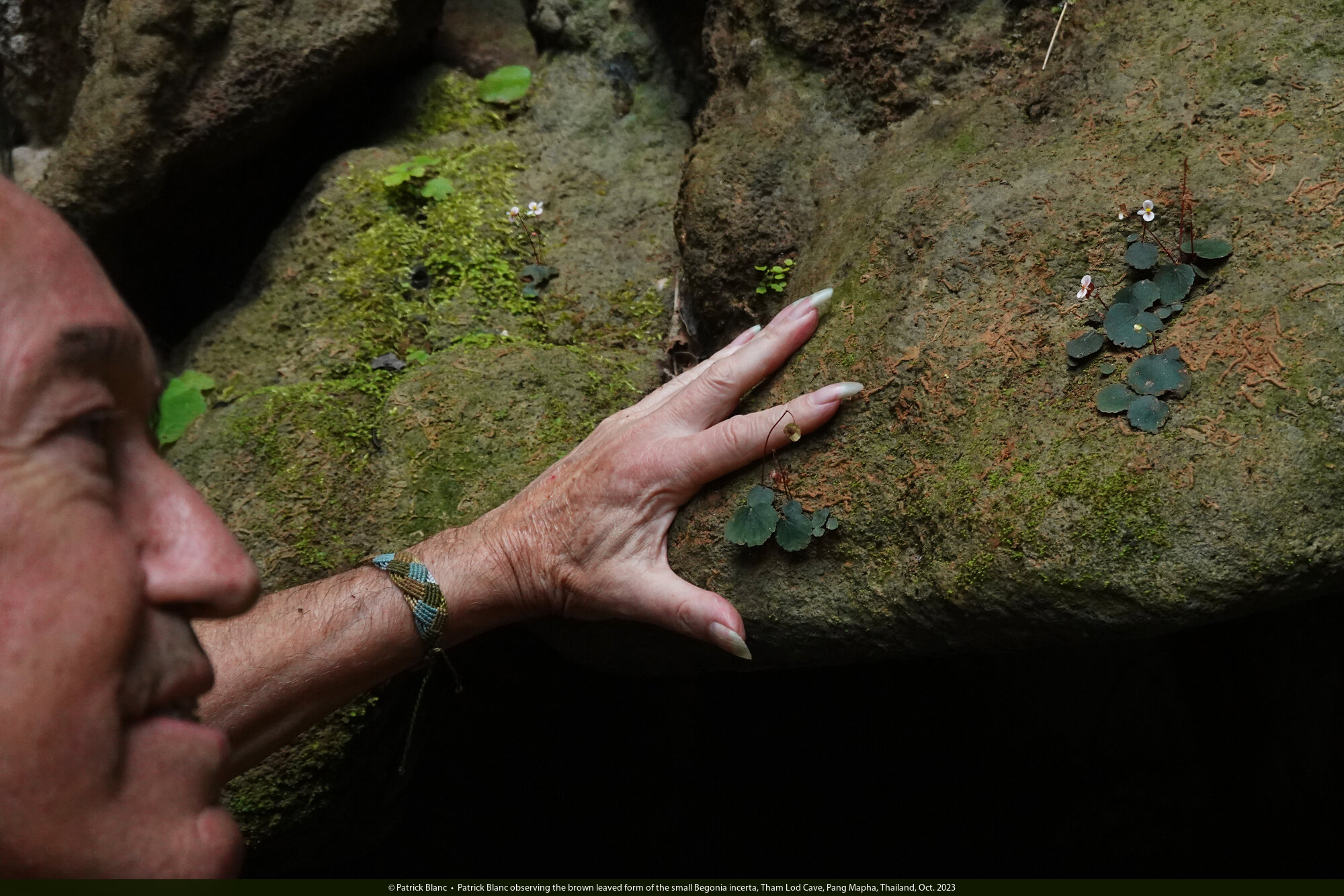 Patrick Blanc observing the brown leaved form of the small Begonia incerta, Tham Lod Cave, Pang Mapha, Thailand, Oct. 2023