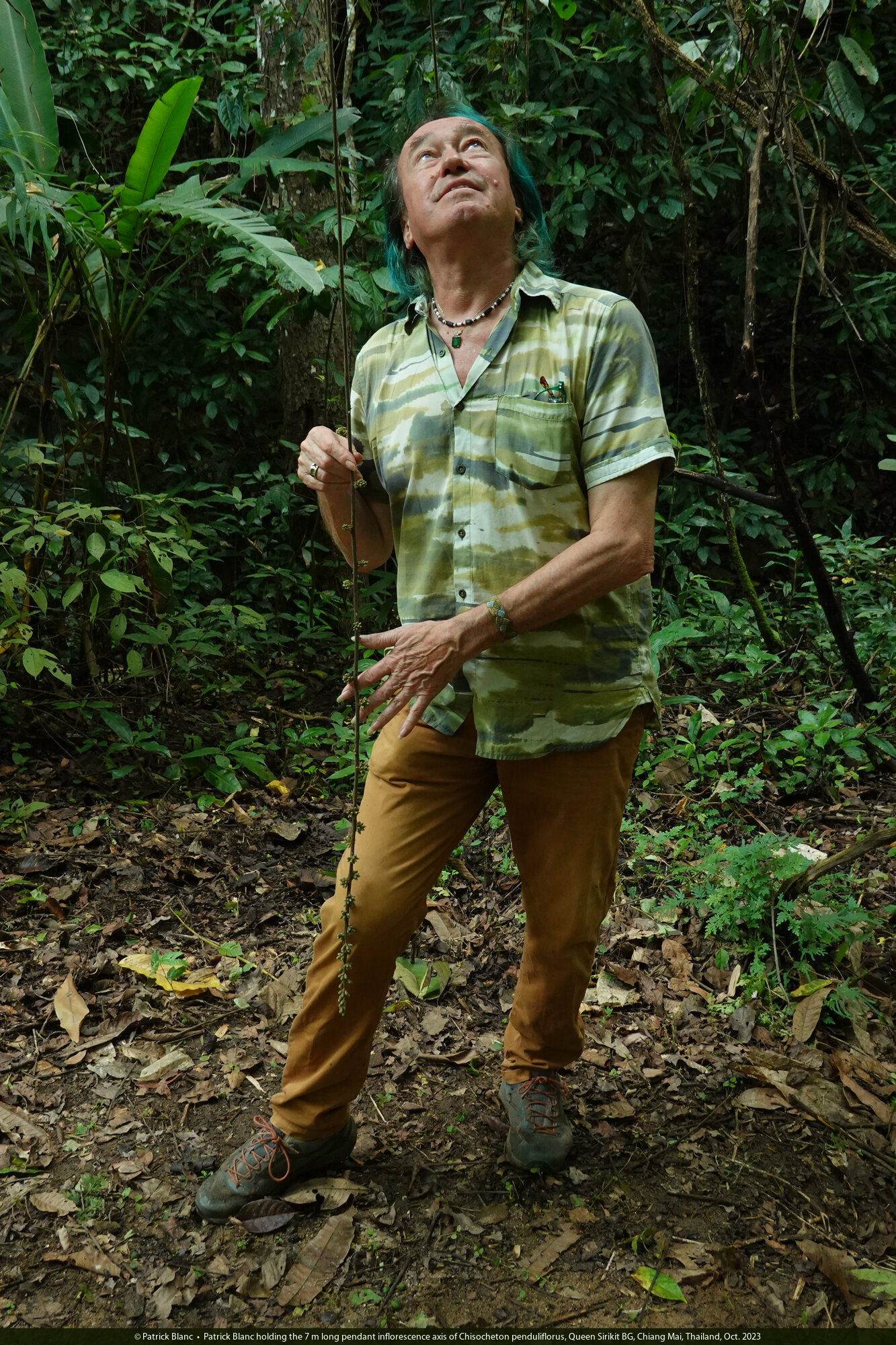 Patrick Blanc holding the 7 m long pendant inflorescence axis of Chisocheton penduliflorus, Queen Sirikit BG, Chiang Mai, Thailand, Oct. 2023