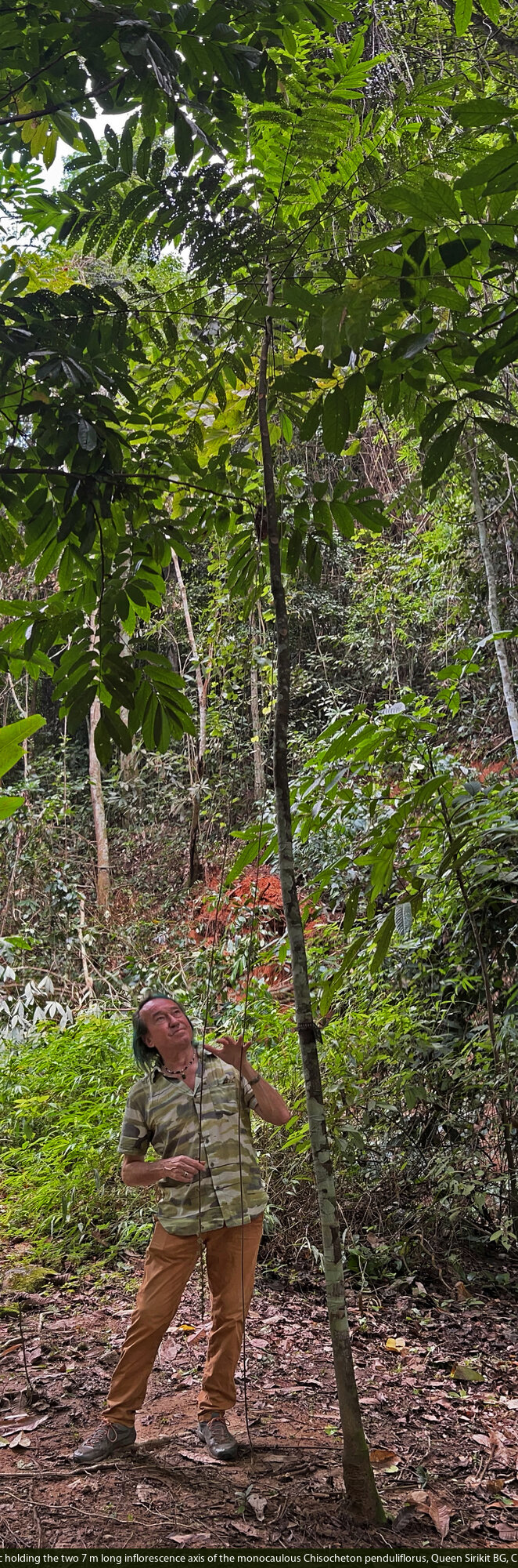 Patrick Blanc holding the two 7 m long inflorescence axis of the monocaulous Chisocheton penduliflorus, Queen Sirikit BG, Chiang Mai, Thailand, Oct. 2023
