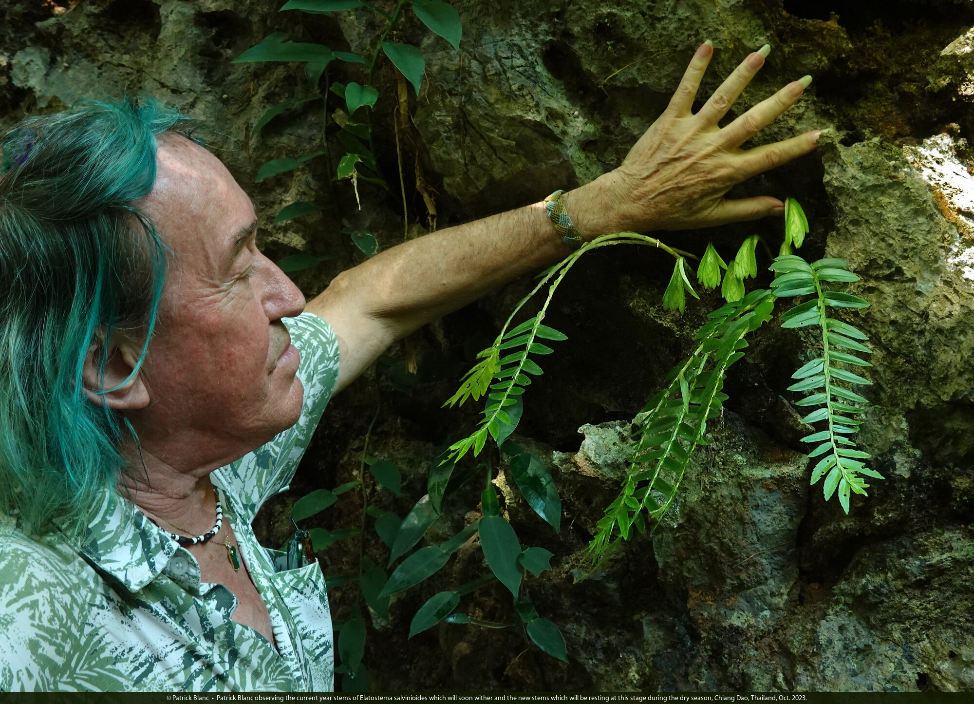 Patrick Blanc observing the current year stems of Elatostema salvinioides which will soon wither and the new stems which will be resting at this stage during the dry season, Chiang Dao, Thailand, Oct. 2023.