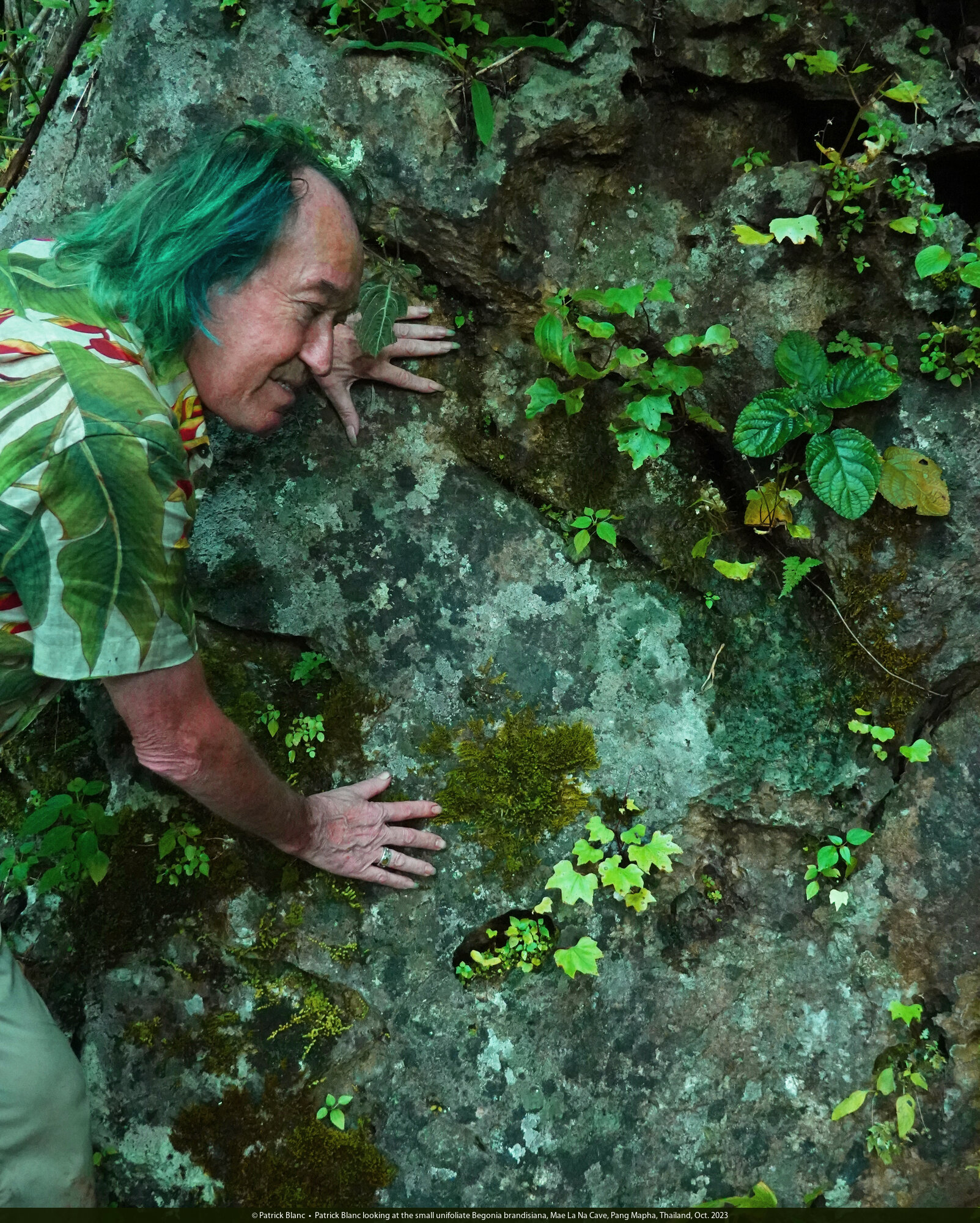 Patrick Blanc looking at the small unifoliate Begonia brandisiana, Mae La Na Cave, Pang Mapha, Thailand, Oct. 2023