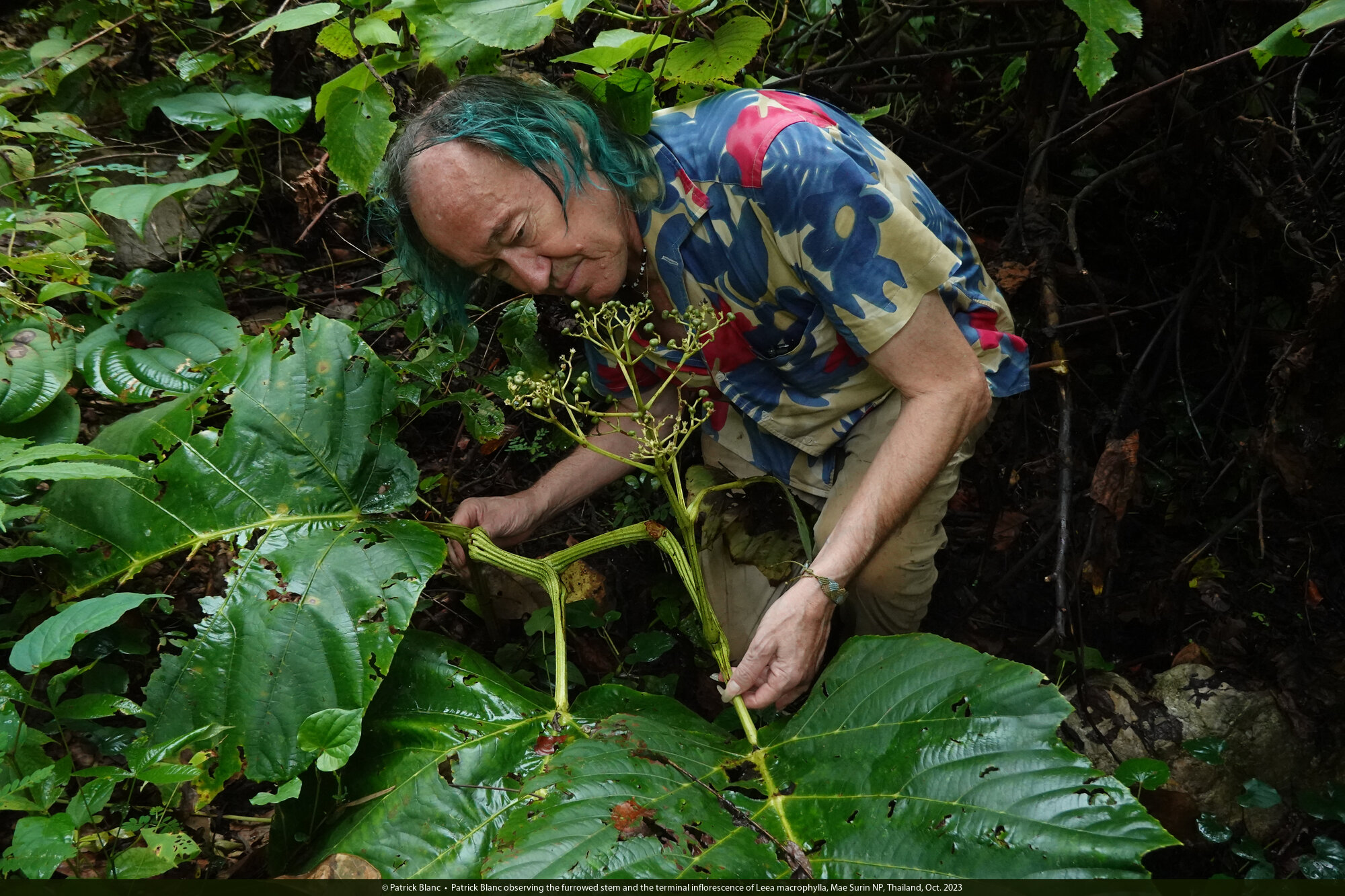 Patrick Blanc observing the furrowed stem and the terminal inflorescence of Leea macrophylla, Mae Surin NP, Thailand, Oct. 2023
