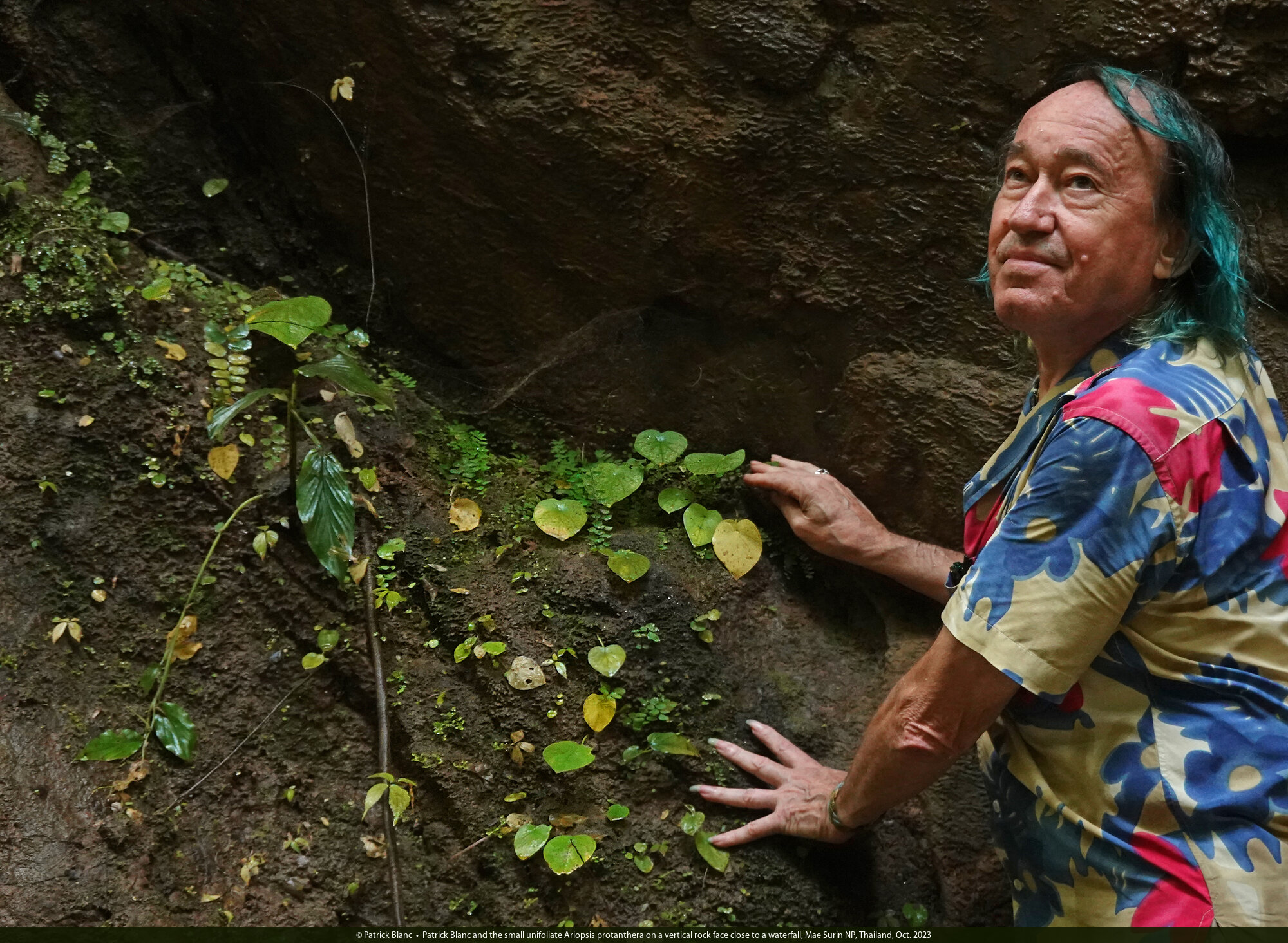 Patrick Blanc and the small unifoliate Ariopsis protanthera on a vertical rock face close to a waterfall, Mae Surin NP, Thailand, Oct. 2023