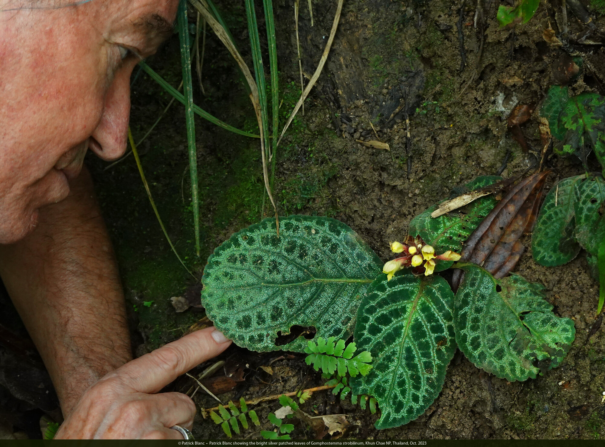 Patrick Blanc showing the bright silver patched leaves of Gomphostemma strobilinum, Khun Chae NP, Thailand, Oct. 2023